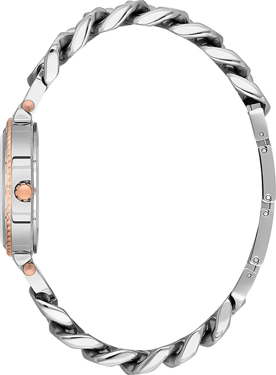 Женские кварцевые часы Daniel Klein — это стильный и оригинальный аксессуар. Корпус диаметром 33 мм выполнен из нержавеющей стали. БезельБезельВнешний ободок, закрепляющий стекло. В спортивных часах так называется поворотное кольцо с делениями на циферблате, выполняет роль таймера – замеряет отрезки времени на шкале. Неподвижный безель – элемент декора. Однонаправленно вращающийся безель на дайверских часах позволяет фиксировать моменты погружения и выныривания на поверхность. с IP-покрытиемIP-покрытиеМетод ионного напыления. Демонстрирует повышенную устойчивость к истиранию, окислению и химическим веществам. Под воздействием высокого давления и температуры около 1500°C молекулы металла надёжно соединяются с частицами корпуса часов. декорирован узором. Циферблат серебристого цвета имеет центральную часть с декоративным узором в виде расходящихся лучей, индексы представлены точками и римскими цифрами в положениях 4, 8 и 12 часов. Стрелки мечевидные, в стиле Sword. Циферблат защищён минеральным стекломМинеральное стеклоМинеральное стекло представляет собой искусственно выращенный минерал кварца. Такое стекло отличается особой устойчивостью к повреждениям и царапинам. Уступает по некоторым качествам сапфировому стеклу.. Механизм — японское кварцевое движение калибра Miyota 2035. Часы оснащены стальным браслетом в виде массивной цепочки на ювелирной застёжкеРаскладной замокДанный вариант застежки используется только на часах с металлическим браслетом. Отличительная особенность такого крепления в том, что длина браслета становится универсальной и вы можете самостоятельно отрегулировать нужный вам размер – застежка просто двигается по браслету часов.. Водонепроницаемость 30 м позволяет использовать часы в повседневных условиях. Идеальный выбор для тех, кто ценит турецкое качество и элегантный дизайн.