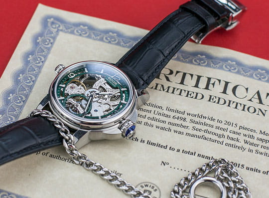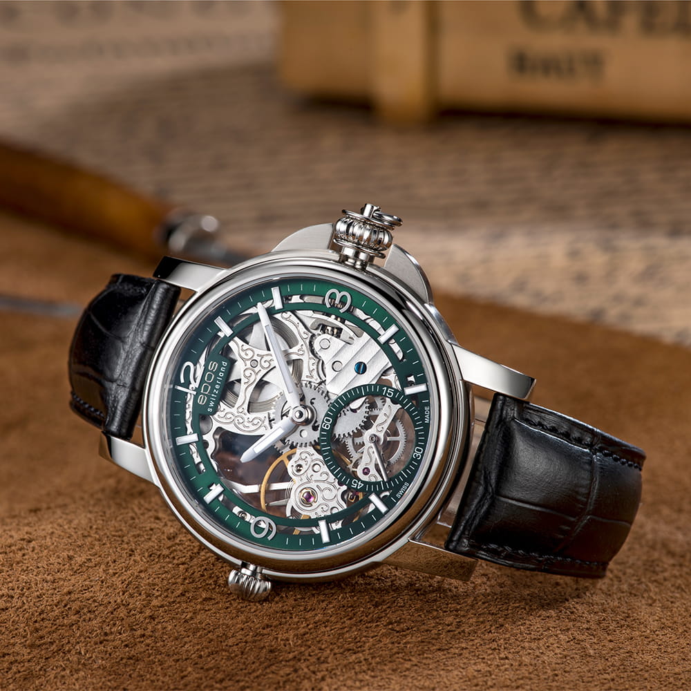 Мужские механические часы с ручным подзаводом Epos из коллекции Oeuvre d'art — это настоящее произведение часового искусства. Корпус диаметром 45 мм и толщиной 13 мм выполнен из нержавеющей стали 316L. Циферблат изумрудно-зелёного цвета частично скелетонизирован, с открытой центральной частью, что позволяет наблюдать за работой механизма. Циферблат защищён сапфировым стекломСапфировое стеклоПрочный и надёжный материал из кристалла сапфира синтетического происхождения, характеризующийся особой твёрдостью и устойчивостью к царапинам и повреждениям.. Малая секундная стрелка вынесена на отдельный циферблат. Механизм — швейцарский калибр ETA Unitas 6498 с ручным подзаводом, модифицированный и декорированный вручную: мосты скелетонизированы, украшены гравировкой и жемчужным зернением. Прозрачная задняя крышка позволяет наблюдать за работой механизма. Заводная головка — винтовая, формы «луковица». Часы оснащены кожаным ремешком чёрного цвета с тиснением под аллигатора и застёжкой «бабочка» с кнопкамиЗастёжка "бабочка"Такой вид застёжки дополняется предохранителями, помогающими избежать случайного раскрытия браслета. Обладают изящным исполнением. . Модель выпущена ограниченной серией — 2015 экземпляров. Водонепроницаемость 50 м позволяет использовать часы в повседневных условиях. Гарантия — 24 месяца. Уникальный выбор для ценителя ручного мастерства и эксклюзивного дизайна.