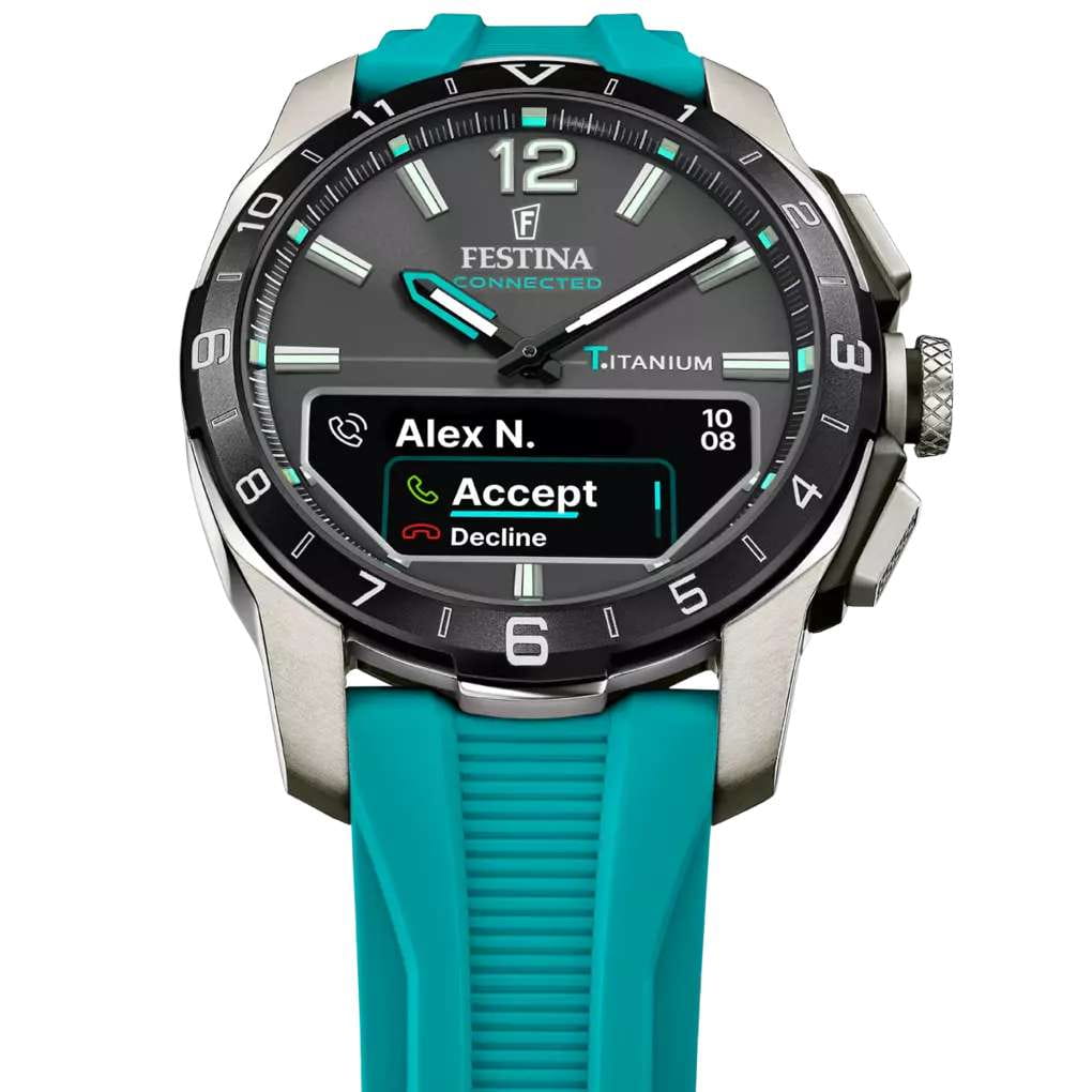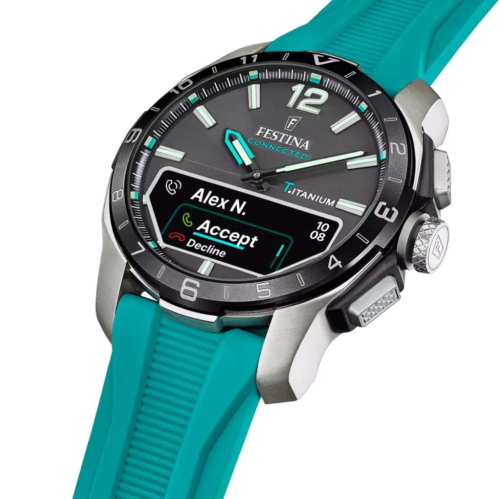 Мужские гибридные умные часы Festina Connected D — это современный аксессуар, сочетающий классический аналоговый дизайн и передовые технологии. Корпус диаметром 44 мм выполнен из лёгкого титана. БезельБезельВнешний ободок, закрепляющий стекло. В спортивных часах так называется поворотное кольцо с делениями на циферблате, выполняет роль таймера – замеряет отрезки времени на шкале. Неподвижный безель – элемент декора. Однонаправленно вращающийся безель на дайверских часах позволяет фиксировать моменты погружения и выныривания на поверхность. с IP-покрытиемIP-покрытиеМетод ионного напыления. Демонстрирует повышенную устойчивость к истиранию, окислению и химическим веществам. Под воздействием высокого давления и температуры около 1500°C молекулы металла надёжно соединяются с частицами корпуса часов.. Циферблат чёрного цвета оформлен штрихами и стрелками. В центре циферблата расположен небольшой OLED-дисплей для отображения цифровой информации. Циферблат защищён сапфировым стекломСапфировое стеклоПрочный и надёжный материал из кристалла сапфира синтетического происхождения, характеризующийся особой твёрдостью и устойчивостью к царапинам и повреждениям.. Часы оснащены функциями BluetoothBluetoothСовременная технология, позволяющая синхронизировать часы с телефоном и переносить данные. Часы с Bluetooth расширяют возможности вашего смартфона и делают его использование ещё более удобным., мирового времениМировое время Полезное часовое усложнение, отображающее время в основных городах и известных областях по всему миру, оно связано с часовыми поясами, удобно для путешественников и бизнесменов. , будильника, таймера обратного отсчёта, секундомера, а также уведомлений о звонках, сообщениях и напоминаниях. Стрелки и метки с люминесцентным покрытиемЛюминесцентное покрытиеПозволяет считывать показания времени в темноте. Производители наносят на стрелки, часовые индексы, безель или поверхность циферблата светонакопительный состав, дающий холодное свечение. обеспечивают читаемость в темноте. Часы оснащены силиконовым ремешком зелёного цвета на стандартной пряжке. Водонепроницаемость 30 м позволяет использовать часы в повседневных условиях. Идеальный выбор для тех, кто ценит стиль, точность и интеллектуальные функции.
