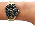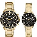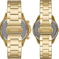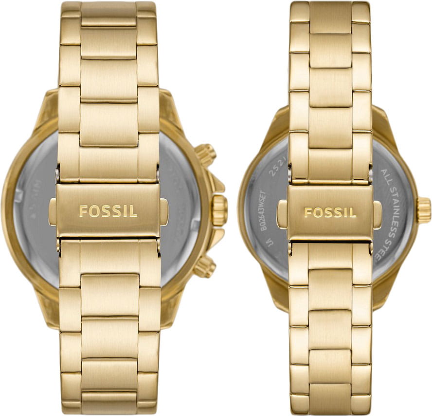 Парный комплект часов Fossil Bannon BQ2643SET, кварцевый механизм с высокой точностью. Минеральное стеклоМинеральное стеклоМинеральное стекло представляет собой искусственно выращенный минерал кварца. Такое стекло отличается особой устойчивостью к повреждениям и царапинам. Уступает по некоторым качествам сапфировому стеклу. устойчивое к мелким механическим повреждениям. Класс водозащиты: 50 метров, позволит защитить корпус от случайных брызг или капель дождя. Корпус часов изготовлен из стали с PVD-покрытиемPVDУльтратонкое покрытие наносится в технике вакуумного напыления, сочетает в себе нитрид титана особой прочности со слоем золота или оксида хрома. Несёт в себе декоративную или защитную функцию.. Стрелки и метки с люминесцентным покрытиемЛюминесцентное покрытиеПозволяет считывать показания времени в темноте. Производители наносят на стрелки, часовые индексы, безель или поверхность циферблата светонакопительный состав, дающий холодное свечение.. Функции даты, дня недели и 24 часового формата времени вынесены на отдельные циферблаты. Ширина корпуса для мужских часов: 45мм, для женских часов: 34мм. Рифленая заводная головка с защитой. Стальной браслет на раскладной застёжкеРаскладная застёжкаТакой тип застёжки используется только на браслетах из металла. Она никогда не раскрывается полностью, происходит разделение на 2 и более частей. Раскладывающая застёжка снизит вероятность потери часов к минимуму. с PVD-покрытиемPVDУльтратонкое покрытие наносится в технике вакуумного напыления, сочетает в себе нитрид титана особой прочности со слоем золота или оксида хрома. Несёт в себе декоративную или защитную функцию.. Ширина браслета для мужских часов: 22мм, для женских часов: 16мм.