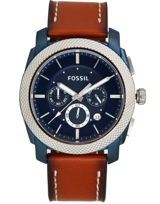 Мужские кварцевые часы FS5232 Fossil Machine Chronograph. Корпус часов изготовлен из нержавеющей стали. Стрелки и метки с люминесцентным покрытиемЛюминесцентное покрытиеПозволяет считывать показания времени в темноте. Производители наносят на стрелки, часовые индексы, безель или поверхность циферблата светонакопительный состав, дающий холодное свечение.. Минеральное стеклоМинеральное стеклоМинеральное стекло представляет собой искусственно выращенный минерал кварца. Такое стекло отличается особой устойчивостью к повреждениям и царапинам. Уступает по некоторым качествам сапфировому стеклу. устойчивое к появлению царапин, обладающее высокой прозрачностью. Водозащита: 50 метров, позволит защитить корпус от случайных брызг или капель дождя. Кожаный ремешок.