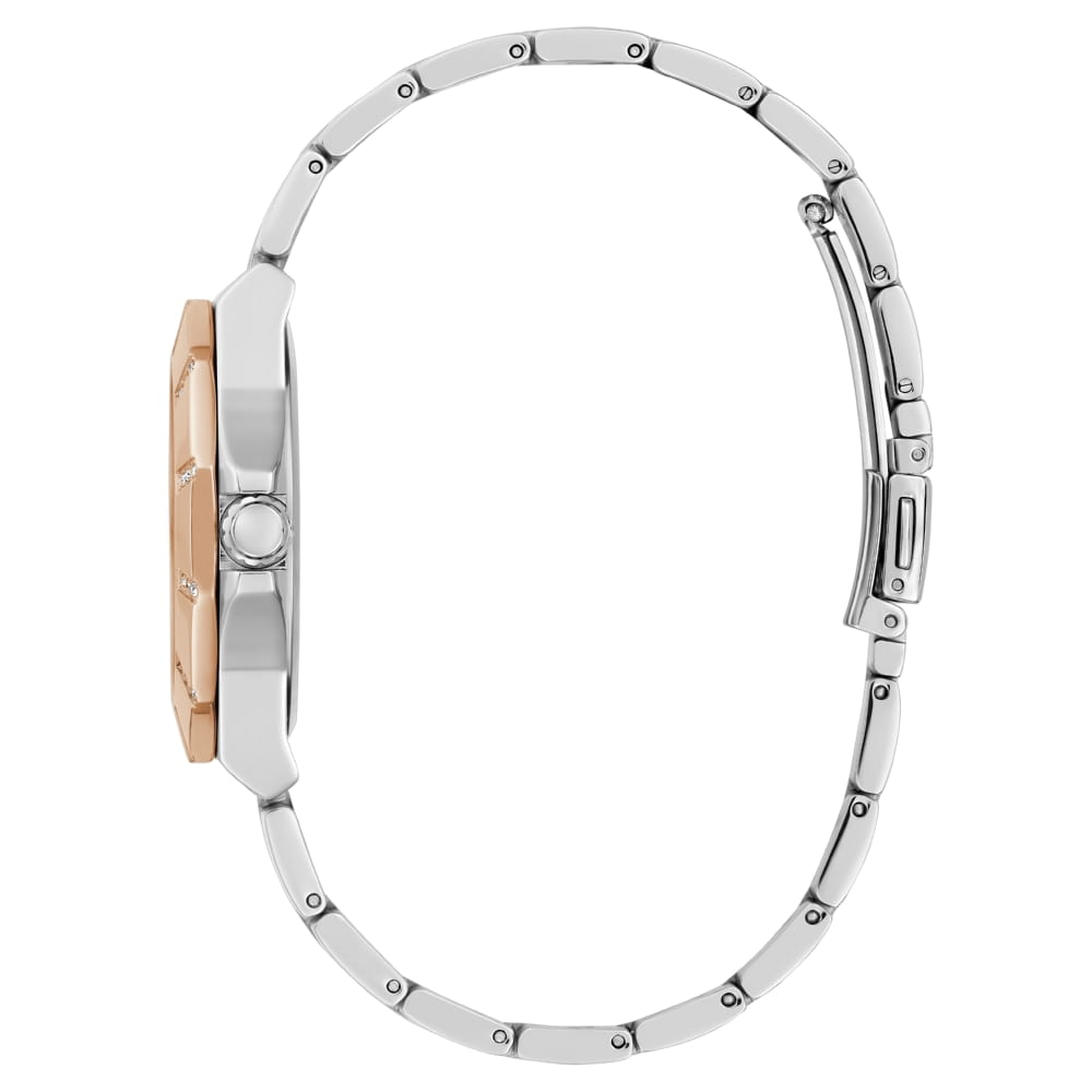 Женские наручные часы с минеральным стекломМинеральное стеклоМинеральное стекло представляет собой искусственно выращенный минерал кварца. Такое стекло отличается особой устойчивостью к повреждениям и царапинам. Уступает по некоторым качествам сапфировому стеклу. Guess Sport lady GW0616L3, кварцевый механизм с высокой точностью. Класс водозащиты: 30 метров, позволит защитить корпус от случайных брызг или капель дождя. Корпус часов изготовлен из стали. Стальной браслет на раскладной застёжкеРаскладная застёжкаТакой тип застёжки используется только на браслетах из металла. Она никогда не раскрывается полностью, происходит разделение на 2 и более частей. Раскладывающая застёжка снизит вероятность потери часов к минимуму. с IP-покрытиемIP-покрытиеМетод ионного напыления. Демонстрирует повышенную устойчивость к истиранию, окислению и химическим веществам. Под воздействием высокого давления и температуры около 1500°C молекулы металла надёжно соединяются с частицами корпуса часов..БезельБезельВнешний ободок, закрепляющий стекло. В спортивных часах так называется поворотное кольцо с делениями на циферблате, выполняет роль таймера – замеряет отрезки времени на шкале. Неподвижный безель – элемент декора. Однонаправленно вращающийся безель на дайверских часах позволяет фиксировать моменты погружения и выныривания на поверхность. с IP-покрытиемIP-покрытиеМетод ионного напыления. Демонстрирует повышенную устойчивость к истиранию, окислению и химическим веществам. Под воздействием высокого давления и температуры около 1500°C молекулы металла надёжно соединяются с частицами корпуса часов. инкрустирован кристаллами. Стрелки и метки с люминесцентным покрытиемЛюминесцентное покрытиеПозволяет считывать показания времени в темноте. Производители наносят на стрелки, часовые индексы, безель или поверхность циферблата светонакопительный состав, дающий холодное свечение..