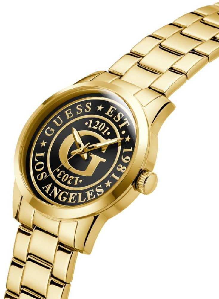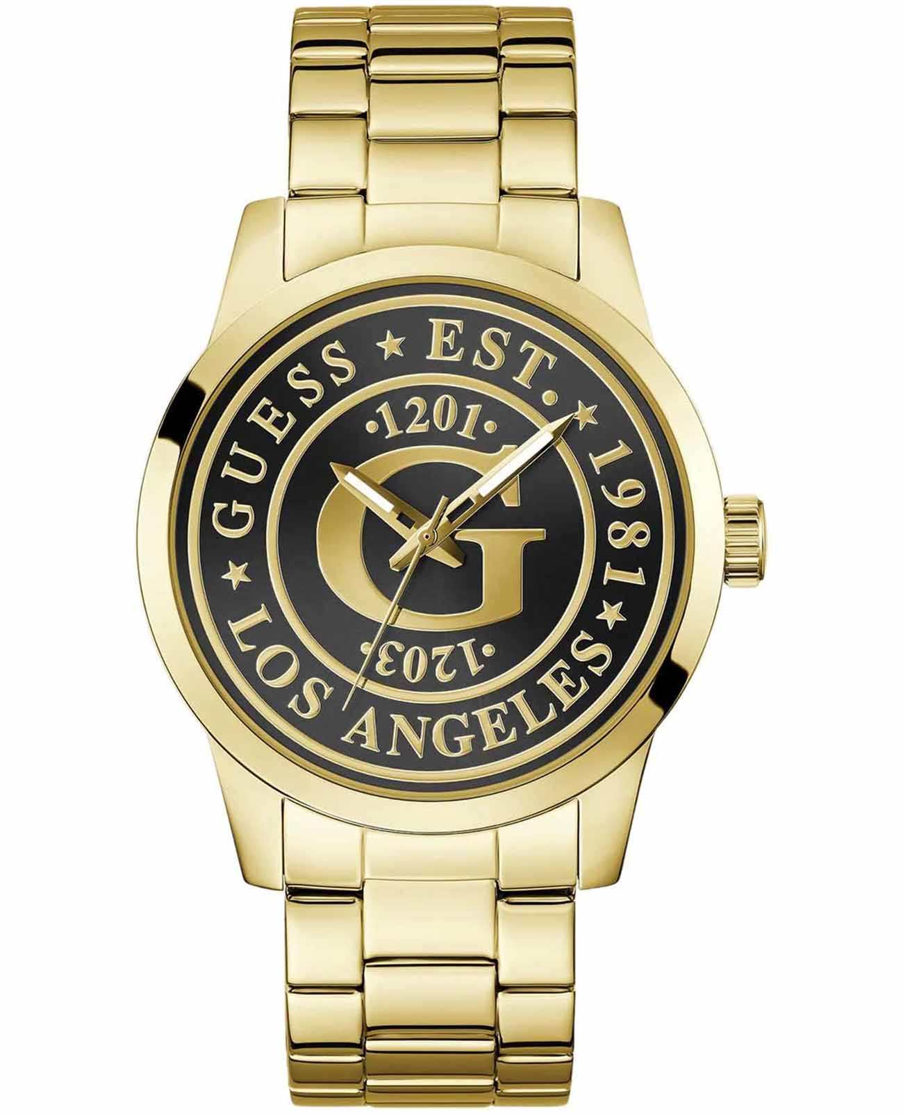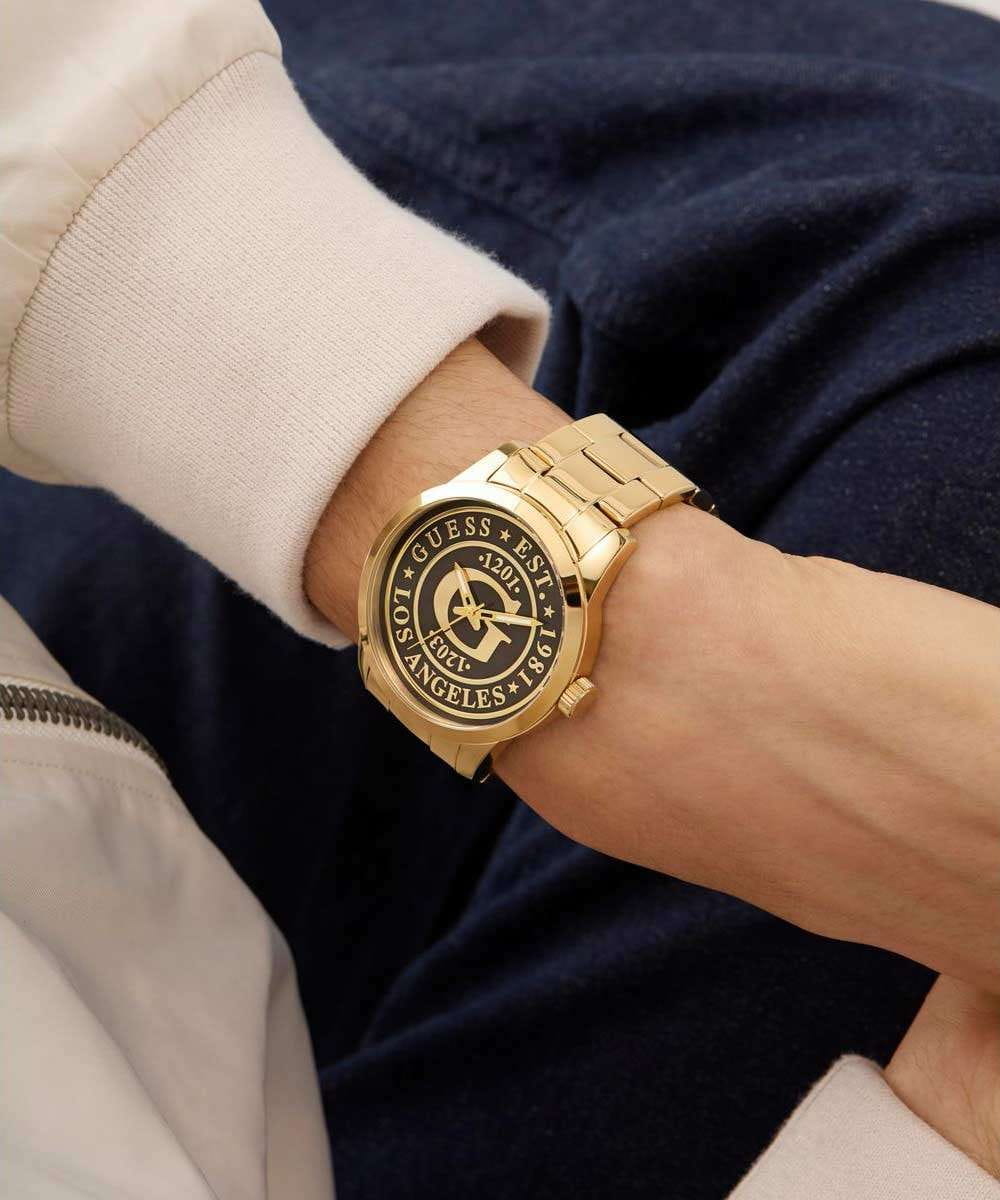 Мужские наручные часы Guess GW0888G2 представляют собой идеальное сочетание современного дизайна и функциональности. Кварцевый механизм гарантирует высокую точность хода, а стальной корпус с золотистым IP-покрытиемIP-покрытиеМетод ионного напыления. Демонстрирует повышенную устойчивость к истиранию, окислению и химическим веществам. Под воздействием высокого давления и температуры около 1500°C молекулы металла надёжно соединяются с частицами корпуса часов. придает аксессуару стильный и устойчивый к внешним воздействиям вид. Диаметр корпуса создает гармонию между элегантностью и практичностью, делая часы привлекательным дополнением к любому образу. Черный циферблат, выполненный по технологии Sunray, создает эффект солнечных лучей, добавляя глубины и игры света при каждом движении. Люминесцентное покрытиеЛюминесцентное покрытиеПозволяет считывать показания времени в темноте. Производители наносят на стрелки, часовые индексы, безель или поверхность циферблата светонакопительный состав, дающий холодное свечение. на стрелках обеспечивает отличную видимость в темноте. Рифленая заводная головка добавляет изделию изысканный акцент и подчеркивает внимание к деталям. Стальной браслет с золотистым IP-покрытиемIP-покрытиеМетод ионного напыления. Демонстрирует повышенную устойчивость к истиранию, окислению и химическим веществам. Под воздействием высокого давления и температуры около 1500°C молекулы металла надёжно соединяются с частицами корпуса часов. обеспечивает надежность и долговечность, а раскладная застежкаРаскладная застёжкаТакой тип застёжки используется только на браслетах из металла. Она никогда не раскрывается полностью, происходит разделение на 2 и более частей. Раскладывающая застёжка снизит вероятность потери часов к минимуму. гарантирует удобство и безопасность при ношении. Водозащита 30WR защищает часы от случайных брызг и дождя, что делает их подходящими для повседневной жизни. Минеральное стеклоМинеральное стеклоМинеральное стекло представляет собой искусственно выращенный минерал кварца. Такое стекло отличается особой устойчивостью к повреждениям и царапинам. Уступает по некоторым качествам сапфировому стеклу. защищает циферблат от царапин, сохраняя его первозданный вид. Эти часы станут отличным выбором для мужчин, ценящих качество, стиль и надежность в одном аксессуаре.