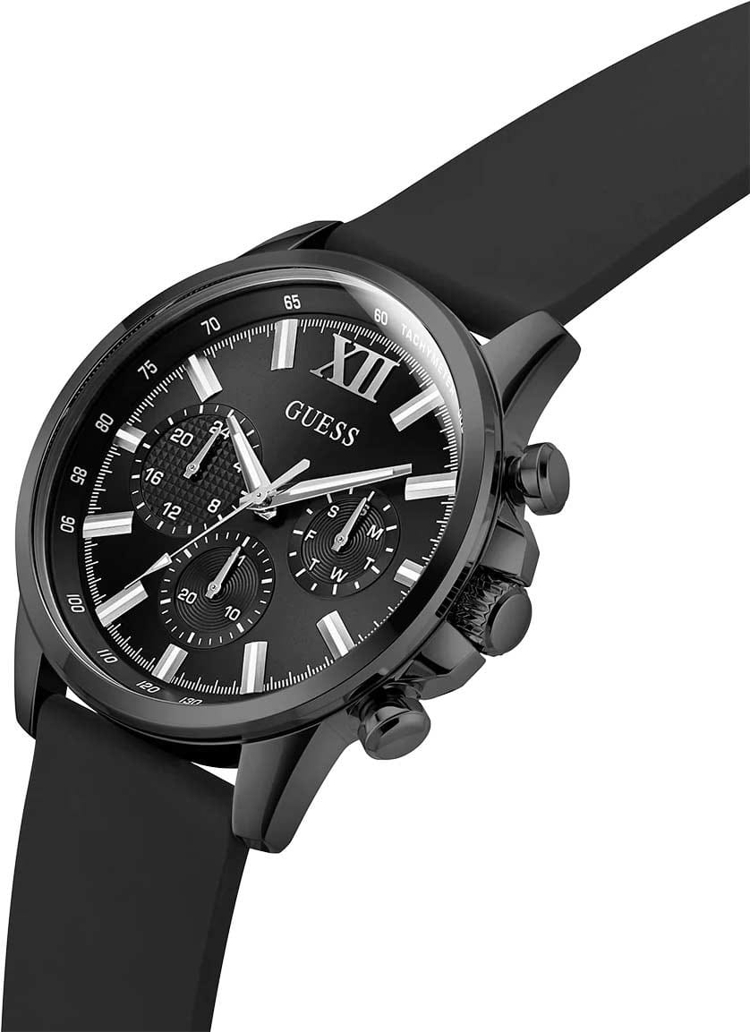Стильные и функциональные часы Guess GW0913G3 оснащены кварцевым механизмом, что обеспечивает точность и надежность в использовании. Корпус выполнен из прочной стали с черным IP-покрытиемIP-покрытиеМетод ионного напыления. Демонстрирует повышенную устойчивость к истиранию, окислению и химическим веществам. Под воздействием высокого давления и температуры около 1500°C молекулы металла надёжно соединяются с частицами корпуса часов., придающей изделиям утонченный и современный вид. Черный циферблат украшен метками в виде штрихов и римской цифрой XII, обеспечивающими легкое считывание времени. Время отображается в двух форматах — 12-ти и 24-х часовом, что удобно для тех, кто привык к разным системам времени. Дополнительные циферблаты показывают дату и день недели, что позволяет всегда быть в курсе текущей даты без необходимости использования других устройств. Часы также оснащены тахиметромТахиметрРазмеченная шкала, располагается на ободке или безеле часов. Тахиметр позволяет рассчитать скорость на определённом участке пути, расстояние измеряется в километрах или милях., что добавляет им функциональности и может быть полезно для измерения скорости. Люминесцентное покрытиеЛюминесцентное покрытиеПозволяет считывать показания времени в темноте. Производители наносят на стрелки, часовые индексы, безель или поверхность циферблата светонакопительный состав, дающий холодное свечение. на стрелках и метках обеспечивает отличную видимость в темноте. Минеральное стеклоМинеральное стеклоМинеральное стекло представляет собой искусственно выращенный минерал кварца. Такое стекло отличается особой устойчивостью к повреждениям и царапинам. Уступает по некоторым качествам сапфировому стеклу. защищает циферблат от царапин и повреждений, а водозащита 50WR позволяет не волноваться о случайных контактах с водой, например, во время дождя. Силиконовый черный ремешок с классической застежкой обеспечивает надежную фиксацию часов на руке и комфорт в ношении. Рифленая заводная головка с защитой добавляет изысканности и одновременно защищает механизм от повреждений. Эти часы идеально подойдут для тех, кто ценит стиль, функциональность и качество в одном аксессуаре.