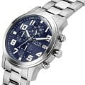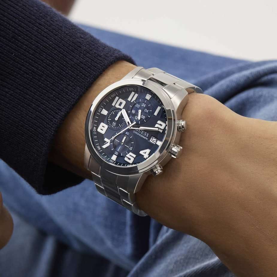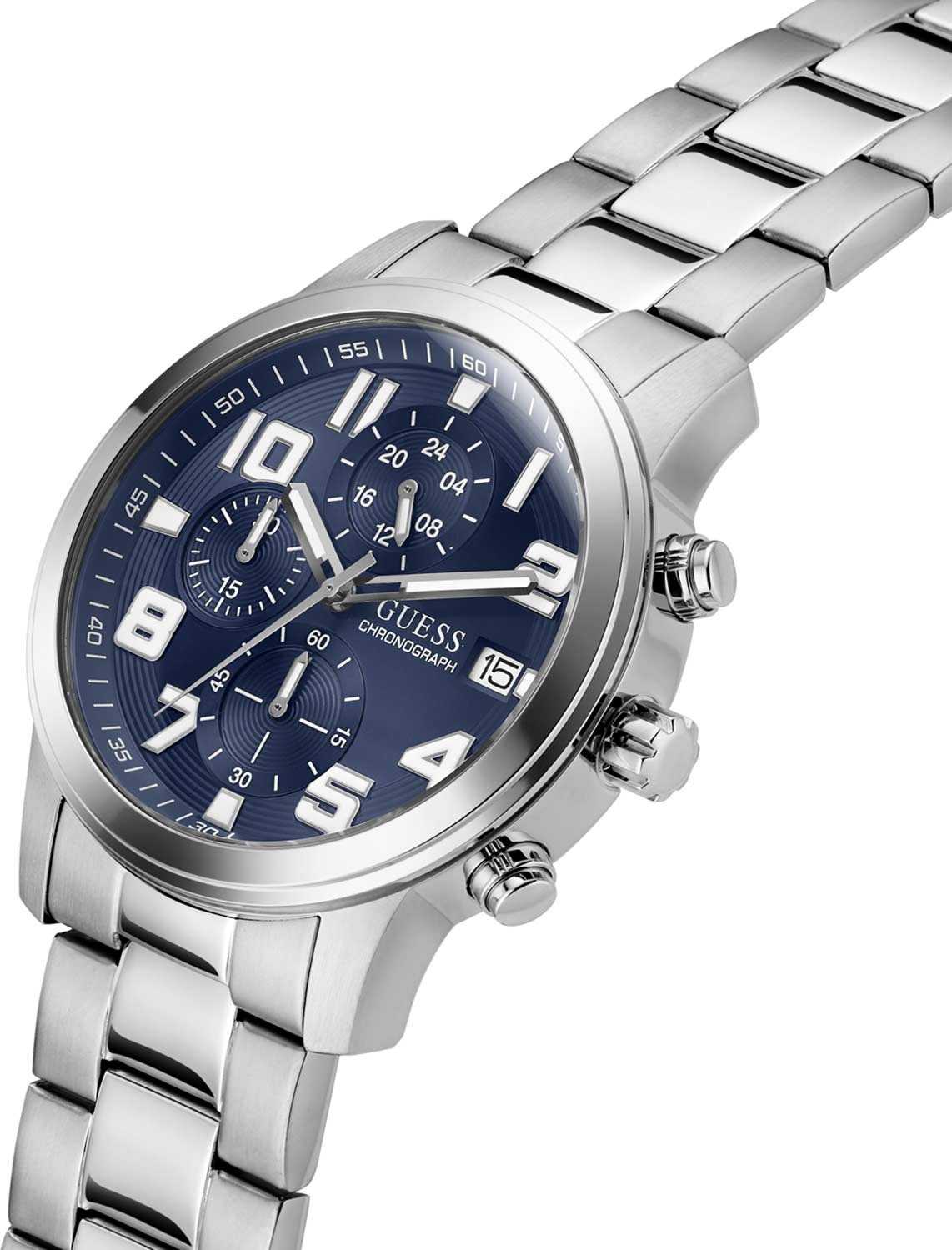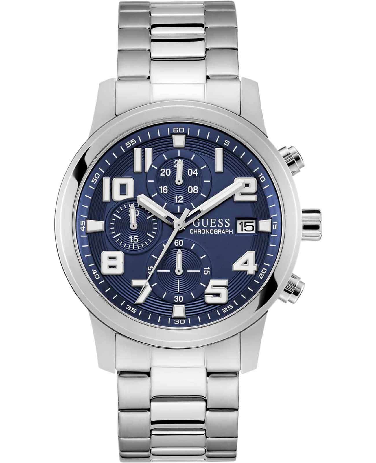Часы Guess GW0917G1 — это стильный и функциональный аксессуар, который поможет вам всегда быть в курсе времени, независимо от обстоятельств. Эти мужские часы оснащены надежным кварцевым механизмом и имеют круглый стальной корпус диаметром 44 мм и толщиной 13 мм. Синий циферблат, выполненный по технологии Sunray, создает эффект солнечных лучей, добавляя глубину и элегантность дизайну. Циферблат оснащен метками в виде арабских цифр и поддерживает 12-ти и 24-х часовой формат времени, а окошко даты с днем недели, расположенное в позиции 3 часа, добавляет практичности. Отдельные циферблаты для отображения даты и дня недели делают использование часов особенно удобным. Люминесцентное покрытиеЛюминесцентное покрытиеПозволяет считывать показания времени в темноте. Производители наносят на стрелки, часовые индексы, безель или поверхность циферблата светонакопительный состав, дающий холодное свечение. на стрелках обеспечивает отличную видимость в темноте. Рифленая заводная головка обеспечивает дополнительный комфорт в эксплуатации. Стальной браслет с раскладной застежкойРаскладная застёжкаТакой тип застёжки используется только на браслетах из металла. Она никогда не раскрывается полностью, происходит разделение на 2 и более частей. Раскладывающая застёжка снизит вероятность потери часов к минимуму. гарантирует комфортное ношение и надежную фиксацию.  Минеральное стеклоМинеральное стеклоМинеральное стекло представляет собой искусственно выращенный минерал кварца. Такое стекло отличается особой устойчивостью к повреждениям и царапинам. Уступает по некоторым качествам сапфировому стеклу. защищает циферблат от царапин и повреждений, а водозащита 50WR позволяет не беспокоиться о случайном попадании воды. Эти часы станут отличным дополнением вашего образа, подчеркивая ваш вкус и внимание к деталям.