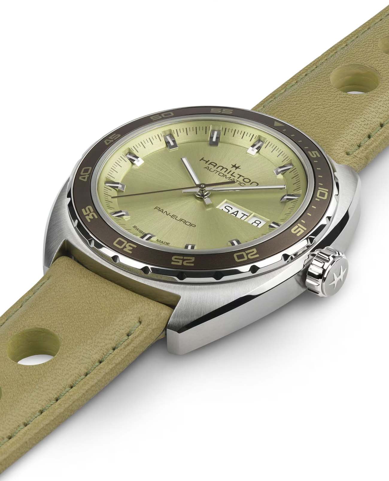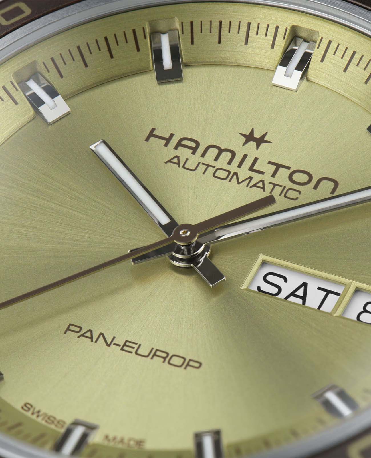 Мужские часы Hamilton American Classic Pan Europ Day Date Auto H35445860. Механизм с автоматическим подзаводом Сапфировое стеклоСапфировое стеклоПрочный и надёжный материал из кристалла сапфира синтетического происхождения, характеризующийся особой твёрдостью и устойчивостью к царапинам и повреждениям. устойчивое к появлению царапин, обладающее высокой прозрачностью. Класс водозащиты: 50 метров, позволит защитить корпус от случайных брызг или капель дождя. Корпус часов изготовлен из нержавеющей стали. Кожаный ремешок с раскладной застёжкойРаскладная застёжкаТакой тип застёжки используется только на браслетах из металла. Она никогда не раскрывается полностью, происходит разделение на 2 и более частей. Раскладывающая застёжка снизит вероятность потери часов к минимуму.. БезельБезельВнешний ободок, закрепляющий стекло. В спортивных часах так называется поворотное кольцо с делениями на циферблате, выполняет роль таймера – замеряет отрезки времени на шкале. Неподвижный безель – элемент декора. Однонаправленно вращающийся безель на дайверских часах позволяет фиксировать моменты погружения и выныривания на поверхность. с PVD-покрытиемPVDУльтратонкое покрытие наносится в технике вакуумного напыления, сочетает в себе нитрид титана особой прочности со слоем золота или оксида хрома. Несёт в себе декоративную или защитную функцию.. В комплект входит сменный тканевый ремешок. Стрелки и метки с люминесцентным покрытиемЛюминесцентное покрытиеПозволяет считывать показания времени в темноте. Производители наносят на стрелки, часовые индексы, безель или поверхность циферблата светонакопительный состав, дающий холодное свечение..
