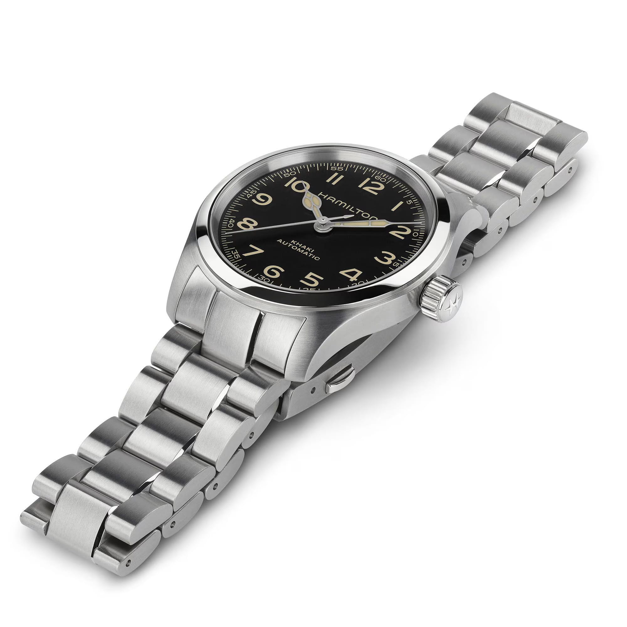 The Khaki Field Murph Auto. Одни из самых известных часов научной фантастики, известные поклонникам как "The Murphy", теперь заключены в компактный 38-миллиметровый корпус из нержавеющей стали. Ультрачитаемый циферблат, бежевые стрелки с люминесцентным покрытиемЛюминесцентное покрытиеПозволяет считывать показания времени в темноте. Производители наносят на стрелки, часовые индексы, безель или поверхность циферблата светонакопительный состав, дающий холодное свечение. Super-LumiNova ® в винтажном стиле и cтальной браслет на раскладной застёжкеРаскладная застёжкаТакой тип застёжки используется только на браслетах из металла. Она никогда не раскрывается полностью, происходит разделение на 2 и более частей. Раскладывающая застёжка снизит вероятность потери часов к минимуму.. отражают ключевые эстетические коды своего 42-миллиметрового предшественника. Эти часы, оснащенные механизмом с автоподзаводом H-10 и обладающие 80-часовым запасом хода, покорят сердца тех, кто любит часы меньшего размера.