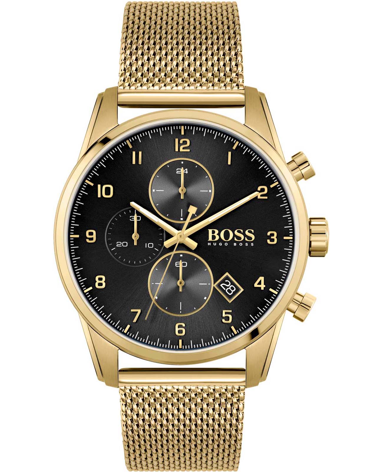 Мужские часы Hugo Boss Skymaster HB1513838 представлены в круглом 44-мм корпусе из нержавеющей стали 316L с золотистым IP-покрытиемIP-покрытиеМетод ионного напыления. Демонстрирует повышенную устойчивость к истиранию, окислению и химическим веществам. Под воздействием высокого давления и температуры около 1500°C молекулы металла надёжно соединяются с частицами корпуса часов. толщиной 10 мм. Оснащены кварцевым механизмом с функцией хронографаХронографФункция позволяет измерять отрезки времени с особой точностью: часы, минуты, секунды. Верным признаком хронографа является наличие на циферблате 3 дополнительных окошек-счётчиков. и секундомераСекундомерСекундоме́р — прибор, способный измерять интервалы времени с точностью до долей секунды.. Черный циферблат с арабскими цифрами защищен устойчивым к царапинам минеральным стекломМинеральное стеклоМинеральное стекло представляет собой искусственно выращенный минерал кварца. Такое стекло отличается особой устойчивостью к повреждениям и царапинам. Уступает по некоторым качествам сапфировому стеклу.. Стальной браслет с миланским плетением и с IP-покрытиемIP-покрытиеМетод ионного напыления. Демонстрирует повышенную устойчивость к истиранию, окислению и химическим веществам. Под воздействием высокого давления и температуры около 1500°C молекулы металла надёжно соединяются с частицами корпуса часов. дополнен раскладной застёжкойРаскладная застёжкаТакой тип застёжки используется только на браслетах из металла. Она никогда не раскрывается полностью, происходит разделение на 2 и более частей. Раскладывающая застёжка снизит вероятность потери часов к минимуму.. Водонепроницаемость 50 метров (5 ATM) обеспечивает защиту от брызг воды.