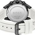 Мужские часы Hugo Boss Admiral HB1513966 представлены в круглом 46-мм корпусе из нержавеющей стали с IP-покрытиемIP-покрытиеМетод ионного напыления. Демонстрирует повышенную устойчивость к истиранию, окислению и химическим веществам. Под воздействием высокого давления и температуры около 1500°C молекулы металла надёжно соединяются с частицами корпуса часов.. Оснащены кварцевым механизмом с функциями хронографаХронографФункция позволяет измерять отрезки времени с особой точностью: часы, минуты, секунды. Верным признаком хронографа является наличие на циферблате 3 дополнительных окошек-счётчиков. и секундомеромСекундомерСекундоме́р — прибор, способный измерять интервалы времени с точностью до долей секунды. на безелеБезельВнешний ободок, закрепляющий стекло. В спортивных часах так называется поворотное кольцо с делениями на циферблате, выполняет роль таймера – замеряет отрезки времени на шкале. Неподвижный безель – элемент декора. Однонаправленно вращающийся безель на дайверских часах позволяет фиксировать моменты погружения и выныривания на поверхность.. Черный циферблат защищен устойчивым к царапинам минеральным стекломМинеральное стеклоМинеральное стекло представляет собой искусственно выращенный минерал кварца. Такое стекло отличается особой устойчивостью к повреждениям и царапинам. Уступает по некоторым качествам сапфировому стеклу.. Силиконовый ремешок белого цвета дополнен стандартной застежкой, а стрелки покрыты люминесцентным составомЛюминесцентное покрытиеПозволяет считывать показания времени в темноте. Производители наносят на стрелки, часовые индексы, безель или поверхность циферблата светонакопительный состав, дающий холодное свечение. для видимости в темноте. Водонепроницаемость 100 метров (10 ATM) позволяет использовать часы для плавания.