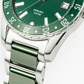 Часы с явными спортивными акцентами могут выглядеть элегантно. Крупный корпус диаметром 42 мм сделан из нержавеющей стали, на широкий безельБезельВнешний ободок, закрепляющий стекло. В спортивных часах так называется поворотное кольцо с делениями на циферблате, выполняет роль таймера – замеряет отрезки времени на шкале. Неподвижный безель – элемент декора. Однонаправленно вращающийся безель на дайверских часах позволяет фиксировать моменты погружения и выныривания на поверхность. вынесена дополнительная индикация. Точный кварцевый механизм отвечает за движение хорошо читаемых стрелок, покрытых люминесцентным составомЛюминесцентное покрытиеПозволяет считывать показания времени в темноте. Производители наносят на стрелки, часовые индексы, безель или поверхность циферблата светонакопительный состав, дающий холодное свечение.. Таким же образом выделены и индексы, поэтому время по этим часам легко определить даже в темноте. В положении «3 часа» находится окошко даты. Еще одна спортивная составляющая — повышенная водостойкость, равная 10 атмосфер: в часах можно плавать. Вместе с этим, модель идеально впишется и в классический образ, и в повседневный. Особая деталь — звенья браслета из высокотехнологичной керамикиВысокотехнологичная керамикаИнновационный запатентованный Rado материал с гладкой или матовой поверхностью. Керамика за счёт кристаллической структуры обладает повышенной устойчивостью от возникновения царапин. Материал способен принимать температуру тела человека, обеспечивая невероятный комфорт при ношении. зеленого цвета, в тон циферблату. Этот материал удобно носить даже в мороз: он быстро нагревается до комфортной температуры тела. К тому же, керамика стойко сопротивляется появлению микроцарапин. На браслет установлена раскладная застёжкаРаскладная застёжкаТакой тип застёжки используется только на браслетах из металла. Она никогда не раскрывается полностью, происходит разделение на 2 и более частей. Раскладывающая застёжка снизит вероятность потери часов к минимуму..