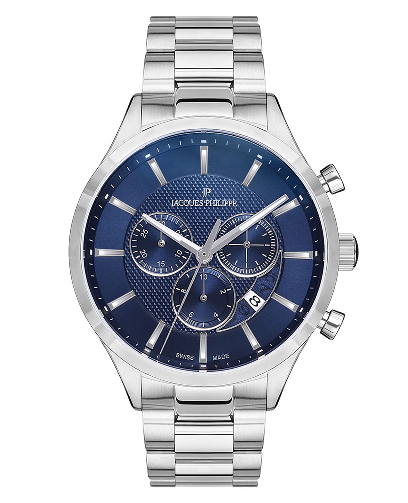 Швейцарские мужские часы-хронографХронографФункция позволяет измерять отрезки времени с особой точностью: часы, минуты, секунды. Верным признаком хронографа является наличие на циферблате 3 дополнительных окошек-счётчиков. Jacques Philippe Gallant JPQGC031336, кварцевый механизм с высокой точностью. Сапфировое стеклоСапфировое стеклоПрочный и надёжный материал из кристалла сапфира синтетического происхождения, характеризующийся особой твёрдостью и устойчивостью к царапинам и повреждениям. устойчивое к появлению царапин, обладающее высокой прозрачностью. Корпус часов изготовлен из нержавеющей стали. На циферблате три дополнительных индикатора. Стрелки с люминесцентным покрытиемЛюминесцентное покрытиеПозволяет считывать показания времени в темноте. Производители наносят на стрелки, часовые индексы, безель или поверхность циферблата светонакопительный состав, дающий холодное свечение.. Окошко даты находится между 4 и 5 часами. Класс водозащиты: 50 метров, позволит защитить корпус от случайных брызг или капель дождя. Стальной браслет на застёжке «бабочка» с кнопкамиЗастёжка "бабочка"Такой вид застёжки дополняется предохранителями, помогающими избежать случайного раскрытия браслета. Обладают изящным исполнением. .
