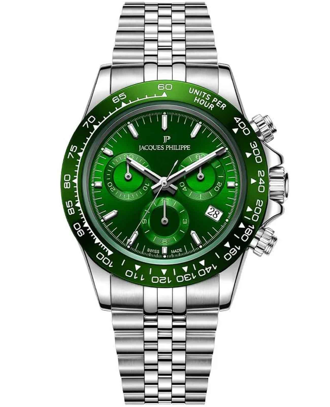Швейцарские наручные часы Jacques Philippe JPQGC7113X6SBG сочетают в себе современный дизайн, надежность и функциональность, это стильные швейцарские часы с функцией хронографаХронографФункция позволяет измерять отрезки времени с особой точностью: часы, минуты, секунды. Верным признаком хронографа является наличие на циферблате 3 дополнительных окошек-счётчиков. и секундомераСекундомерСекундоме́р — прибор, способный измерять интервалы времени с точностью до долей секунды.. Корпус круглой формы диаметром 39 мм выполнен из прочной нержавеющей стали, а безельБезельВнешний ободок, закрепляющий стекло. В спортивных часах так называется поворотное кольцо с делениями на циферблате, выполняет роль таймера – замеряет отрезки времени на шкале. Неподвижный безель – элемент декора. Однонаправленно вращающийся безель на дайверских часах позволяет фиксировать моменты погружения и выныривания на поверхность. с элегантным зеленым IP-покрытиемIP-покрытиеМетод ионного напыления. Демонстрирует повышенную устойчивость к истиранию, окислению и химическим веществам. Под воздействием высокого давления и температуры около 1500°C молекулы металла надёжно соединяются с частицами корпуса часов., а сапфировое стеклоСапфировое стеклоПрочный и надёжный материал из кристалла сапфира синтетического происхождения, характеризующийся особой твёрдостью и устойчивостью к царапинам и повреждениям. надежно защищает зеленый циферблат от царапин и повреждений. Модель оснащена точным кварцевым механизмом RONDA 5030.D-4H, а также дополнительными функциями — тахиметромТахиметрРазмеченная шкала, располагается на ободке или безеле часов. Тахиметр позволяет рассчитать скорость на определённом участке пути, расстояние измеряется в километрах или милях. и индикатором даты, что делает часы не только стильным аксессуаром, но и практичным помощником на каждый день. Серебристый браслет шириной 20 мм удобно фиксируется на запястье с помощью застежки «бабочка»Застёжка "бабочка"Такой вид застёжки дополняется предохранителями, помогающими избежать случайного раскрытия браслета. Обладают изящным исполнением. . Стрелки имеют люминесцентное покрытиеЛюминесцентное покрытиеПозволяет считывать показания времени в темноте. Производители наносят на стрелки, часовые индексы, безель или поверхность циферблата светонакопительный состав, дающий холодное свечение. для удобства чтения времени в темноте. Водозащита 5 АТМ позволяет не снимать часы при дожде и случайных контактах с водой.
