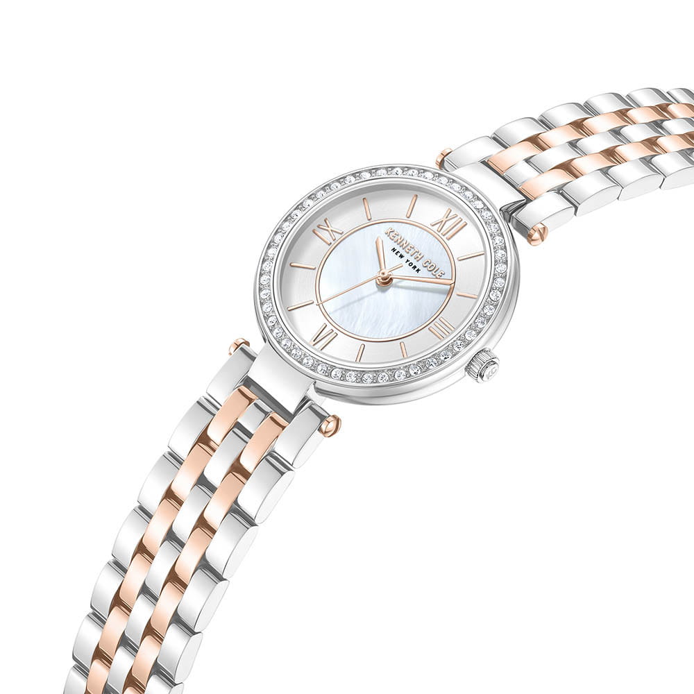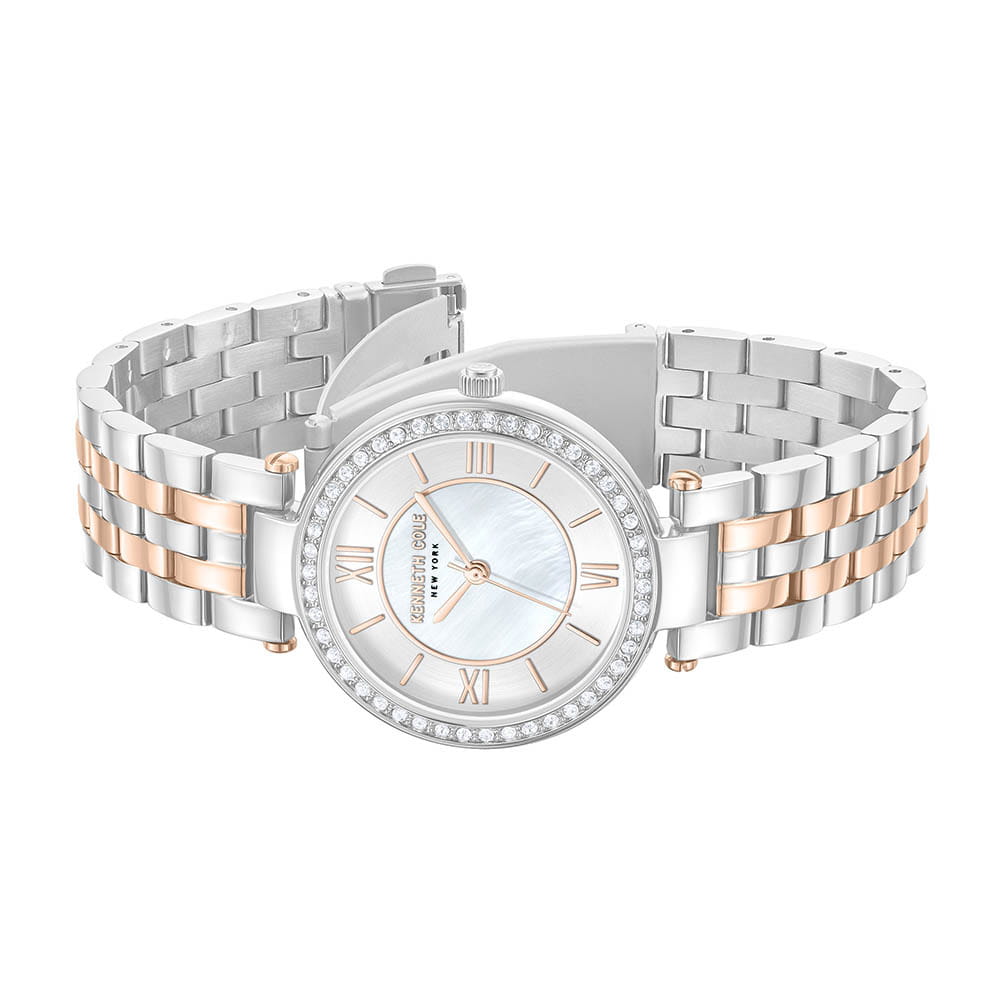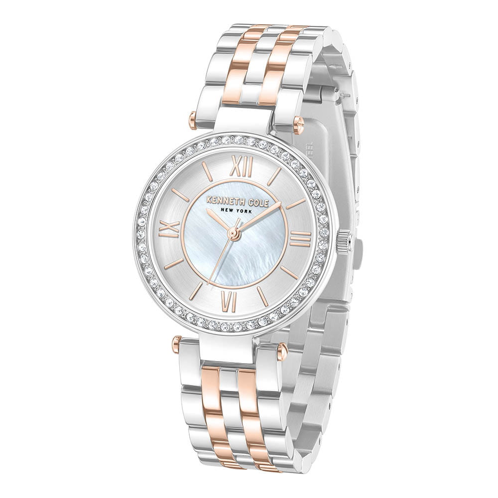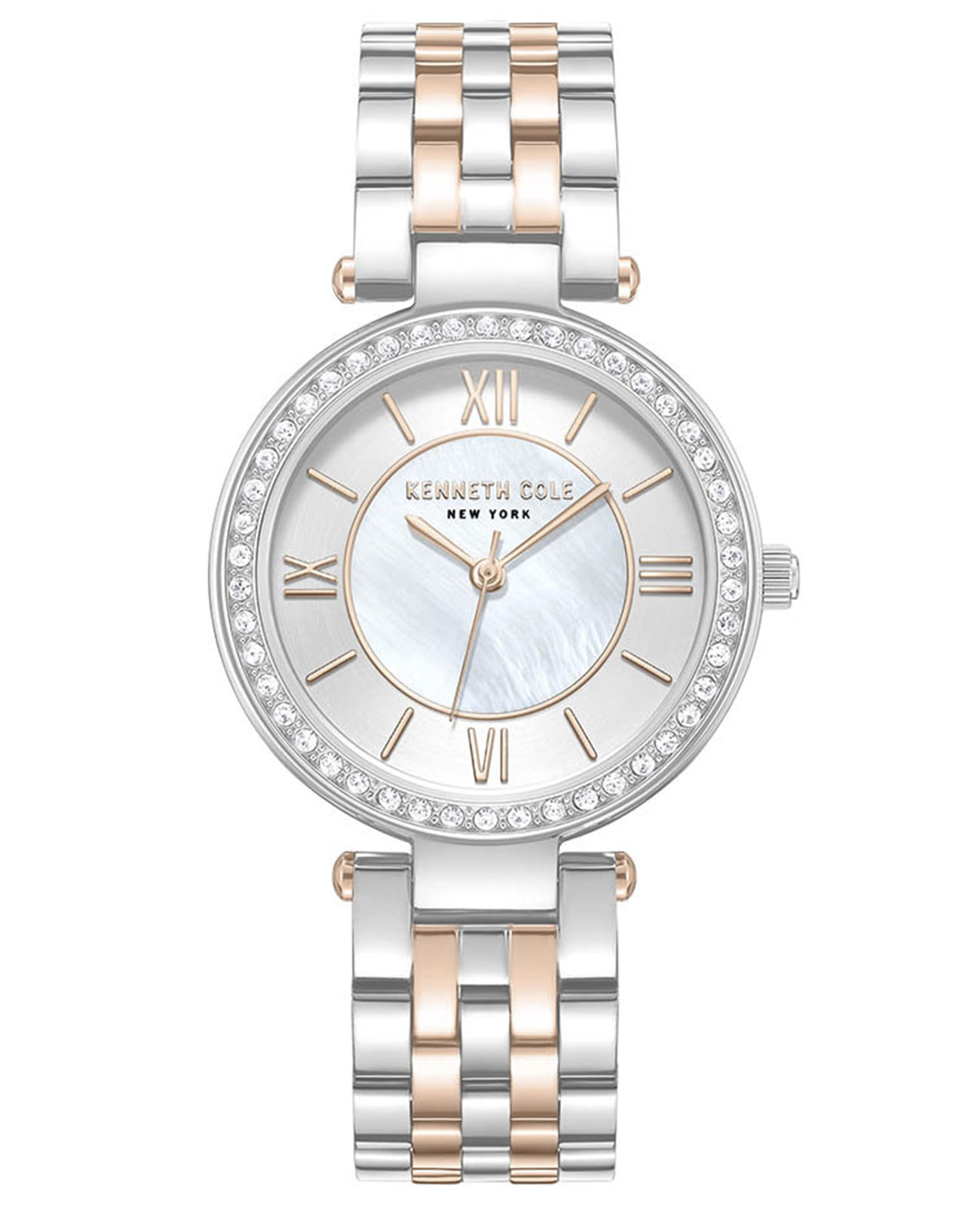 Женские кварцевые часы Kenneth Cole KCWLG0062203 — это изысканный аксессуар, сочетающий элегантность и современный дизайн. Корпус диаметром 32 мм выполнен из нержавеющей стали. Циферблат серебристого цвета украшен вставками из перламутра и стразов из стекла, придающими модели сияние и глубину. Индексы представлены в виде штрихов и Римских цифр. Циферблат защищён минеральным стекломМинеральное стеклоМинеральное стекло представляет собой искусственно выращенный минерал кварца. Такое стекло отличается особой устойчивостью к повреждениям и царапинам. Уступает по некоторым качествам сапфировому стеклу.. Часы оснащены стальным браслетом с IP-покрытиемIP-покрытиеМетод ионного напыления. Демонстрирует повышенную устойчивость к истиранию, окислению и химическим веществам. Под воздействием высокого давления и температуры около 1500°C молекулы металла надёжно соединяются с частицами корпуса часов. на раскладной застёжкеРаскладная застёжкаТакой тип застёжки используется только на браслетах из металла. Она никогда не раскрывается полностью, происходит разделение на 2 и более частей. Раскладывающая застёжка снизит вероятность потери часов к минимуму.. Водонепроницаемость 30 м позволяет использовать часы в повседневных условиях, защищая от случайных брызг и капель дождя. Утончённый стиль и внимание к деталям делают эти часы идеальным выбором для повседневного и торжественного образа.