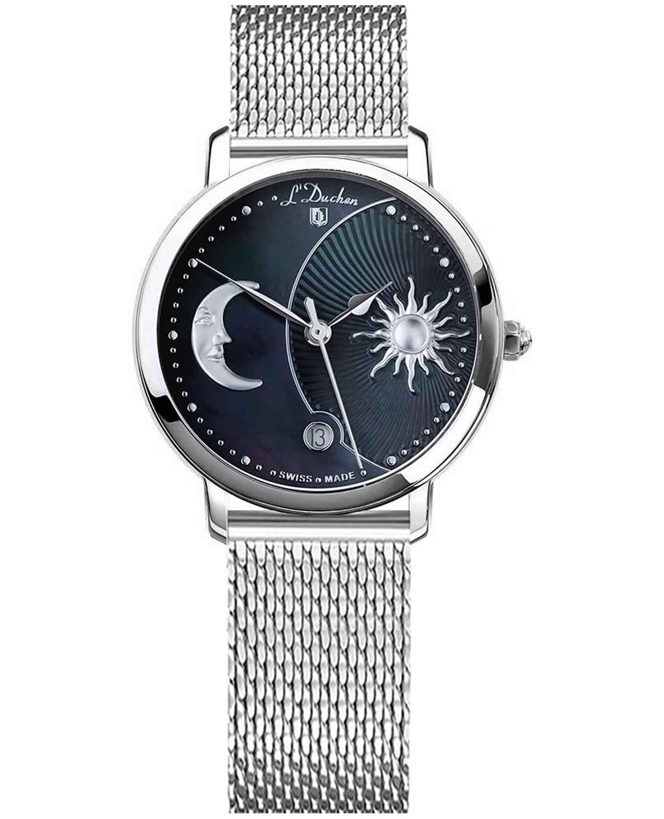 Женские швейцарские часы L'Duchen Day & Night D 781.11.31 M, кварцевый механизм с высокой точностью. Сапфировое стеклоСапфировое стеклоПрочный и надёжный материал из кристалла сапфира синтетического происхождения, характеризующийся особой твёрдостью и устойчивостью к царапинам и повреждениям. устойчивое к появлению царапин, обладающее высокой прозрачностью. Корпус часов выполнен из нержавеющей стали. Окошко даты находится в положении 6 часов. Класс водозащиты: 50 метров, позволит защитить корпус от случайных брызг или капель дождя. Стальной браслет миланского плетения на раскладном замкеРаскладной замокДанный вариант застежки используется только на часах с металлическим браслетом. Отличительная особенность такого крепления в том, что длина браслета становится универсальной и вы можете самостоятельно отрегулировать нужный вам размер – застежка просто двигается по браслету часов..