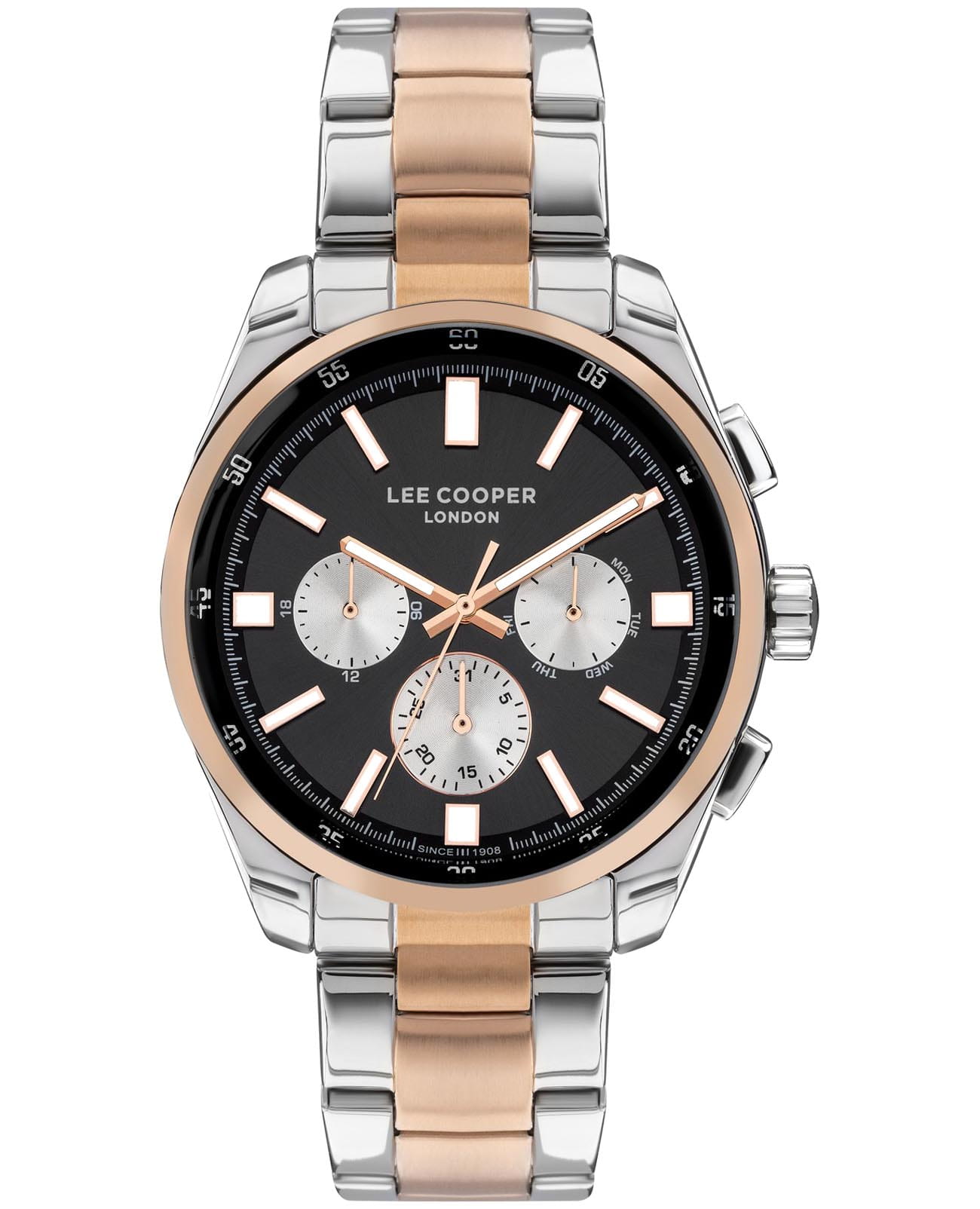 Мужские часы Lee Cooper LC07513.550 — это стильный аксессуар, сочетающий в себе классический дизайн и современные функции. Эти часы идеально подойдут для тех, кто ценит элегантность и практичность в повседневной жизни. Круглый корпус диаметром 46 мм выполнен из суперметалла серебристого цвета. Неподвижный безельБезельВнешний ободок, закрепляющий стекло. В спортивных часах так называется поворотное кольцо с делениями на циферблате, выполняет роль таймера – замеряет отрезки времени на шкале. Неподвижный безель – элемент декора. Однонаправленно вращающийся безель на дайверских часах позволяет фиксировать моменты погружения и выныривания на поверхность. с IP-покрытиемIP-покрытиеМетод ионного напыления. Демонстрирует повышенную устойчивость к истиранию, окислению и химическим веществам. Под воздействием высокого давления и температуры около 1500°C молекулы металла надёжно соединяются с частицами корпуса часов. цвета розового золота придающими модели особый вид. Циферблат защищен минеральным стекломМинеральное стеклоМинеральное стекло представляет собой искусственно выращенный минерал кварца. Такое стекло отличается особой устойчивостью к повреждениям и царапинам. Уступает по некоторым качествам сапфировому стеклу., обеспечивающим устойчивость к царапинам. Метки в виде штрихов. Часы оснащены надежным кварцевым механизмом, а металлический браслет на раскладной застёжкеРаскладная застёжкаТакой тип застёжки используется только на браслетах из металла. Она никогда не раскрывается полностью, происходит разделение на 2 и более частей. Раскладывающая застёжка снизит вероятность потери часов к минимуму. с частичным IP-покрытиемIP-покрытиеМетод ионного напыления. Демонстрирует повышенную устойчивость к истиранию, окислению и химическим веществам. Под воздействием высокого давления и температуры около 1500°C молекулы металла надёжно соединяются с частицами корпуса часов. гарантирует комфортную посадку на запястье. Стрелки и метки с люминесцентным покрытиемЛюминесцентное покрытиеПозволяет считывать показания времени в темноте. Производители наносят на стрелки, часовые индексы, безель или поверхность циферблата светонакопительный состав, дающий холодное свечение. позволяют легко считывать время даже в условиях недостаточного освещения. Водозащита 50 метров позволит защитить корпус от случайных брызг или капель дождя. Lee Cooper — отличный выбор для тех, кто ценит утонченность и качество.