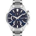 Мужские часы Lee Cooper LC07801.390 выполнены в классическом стиле и сочетают строгий дизайн с расширенным функционалом. Модель оснащена кварцевым механизмом, обеспечивающим точность хода и минимальное обслуживание. Корпус круглой формы имеет размер 46 мм, изготовлен из суперметалла. Циферблат синего цвета дополнен индексами для чёткого отсчёта времени, а также украшен серебристыми стрелками и метками с люминесцентным покрытиемЛюминесцентное покрытиеПозволяет считывать показания времени в темноте. Производители наносят на стрелки, часовые индексы, безель или поверхность циферблата светонакопительный состав, дающий холодное свечение., гармонично дополняющим общий дизайн модели. Часы оснащены функциями отображения даты, дня недели, 24-часового индикатора и второго часового поясаВторой часовой поясФункция, позволяющая отображать время двух часовых поясов одновременно., что делает их особенно удобными для повседневного использования. Защиту циферблата обеспечивает минеральное стеклоМинеральное стеклоМинеральное стекло представляет собой искусственно выращенный минерал кварца. Такое стекло отличается особой устойчивостью к повреждениям и царапинам. Уступает по некоторым качествам сапфировому стеклу., устойчивое к мелким механическим повреждениям. Браслет из стали оснащен раскладной застёжкойРаскладная застёжкаТакой тип застёжки используется только на браслетах из металла. Она никогда не раскрывается полностью, происходит разделение на 2 и более частей. Раскладывающая застёжка снизит вероятность потери часов к минимуму., обеспечивающим комфортное и безопасное ношение. Водозащита 5 АТМ позволяет использовать часы в условиях случайного контакта с водой — например, при мытье рук или под дождём. Это сочетание классического дизайна, прочности материалов и широкой функциональности для уверенных в себе мужчин.