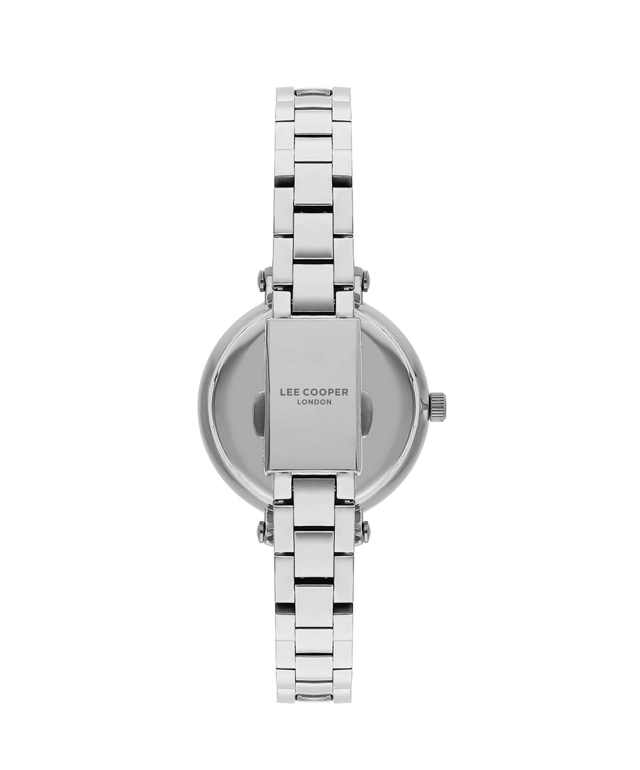 Женские часы Lee Cooper LC07813.390 выполнены в классическом стиле и сочетают строгий дизайн с надёжным механизмом. Модель оснащена кварцевым механизмом, обеспечивающим точность хода и минимальное обслуживание. Корпус круглой формы имеет размер 32 мм, изготовлен из суперметалла, гарантирует комфорт при ношении. Циферблат голубого цвета дополнен индексами для чёткого отсчёта времени. Защиту циферблата обеспечивает минеральное стеклоМинеральное стеклоМинеральное стекло представляет собой искусственно выращенный минерал кварца. Такое стекло отличается особой устойчивостью к повреждениям и царапинам. Уступает по некоторым качествам сапфировому стеклу., устойчивое к мелким механическим повреждениям. Изысканный стальной браслет с керамическими вставками на раскладной застёжкеРаскладная застёжкаТакой тип застёжки используется только на браслетах из металла. Она никогда не раскрывается полностью, происходит разделение на 2 и более частей. Раскладывающая застёжка снизит вероятность потери часов к минимуму. гарантирует комфортную посадку на запястье. Водозащита 3 АТМ позволяет использовать часы в повседневных условиях без риска повреждения от случайных брызг воды. В комплекте к часам идет дополнительный браслет в цвет часов. Это сочетание классического дизайна, прочности материалов и качества исполнения для уверенных в себе женщин.