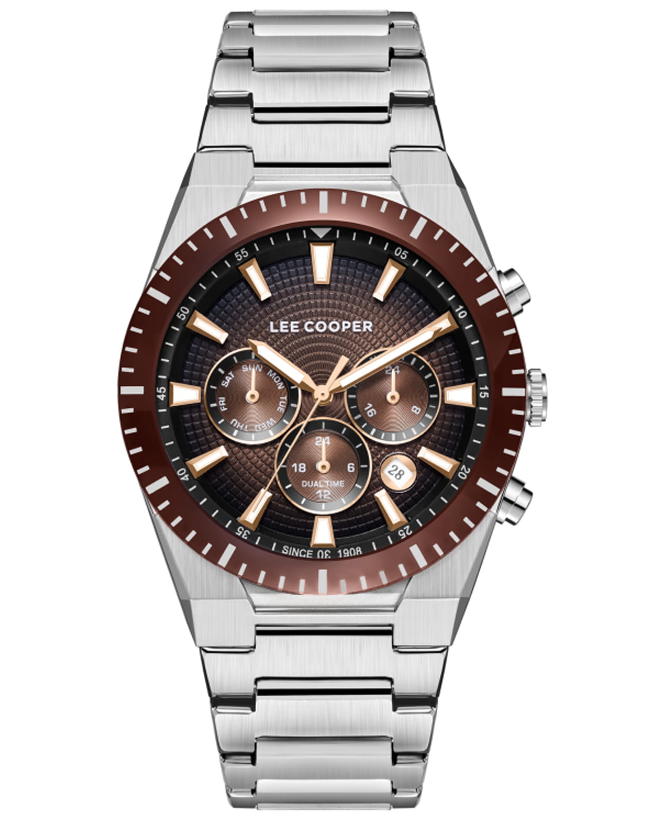 Мужские наручные часы Lee Cooper LC08100.340 — элегантная модель с функциональными возможностями для повседневного использования. Круглый корпус из суперметалла стали придаёт часам классический и современный вид. Коричневый циферблат оснащён дополнительными индикаторами и функцией хронографаХронографФункция позволяет измерять отрезки времени с особой точностью: часы, минуты, секунды. Верным признаком хронографа является наличие на циферблате 3 дополнительных окошек-счётчиков., что позволяет измерять временные интервалы с высокой точностью. Стрелки и метки покрыты люминесцентным покрытиемЛюминесцентное покрытиеПозволяет считывать показания времени в темноте. Производители наносят на стрелки, часовые индексы, безель или поверхность циферблата светонакопительный состав, дающий холодное свечение., обеспечивая удобное считывание показаний в условиях недостаточного освещения. Циферблат защищён минеральным стекломМинеральное стеклоМинеральное стекло представляет собой искусственно выращенный минерал кварца. Такое стекло отличается особой устойчивостью к повреждениям и царапинам. Уступает по некоторым качествам сапфировому стеклу., устойчивым к царапинам. Часы работают на кварцевом механизме, обеспечивающем точность хода. Браслет из нержавеющей стали с раскладной застёжкойРаскладная застёжкаТакой тип застёжки используется только на браслетах из металла. Она никогда не раскрывается полностью, происходит разделение на 2 и более частей. Раскладывающая застёжка снизит вероятность потери часов к минимуму. гарантирует удобную посадку и надёжную фиксацию на запястье. Водозащита 50 метров защищает часы от брызг и дождя, делая их подходящими для повседневного использования.