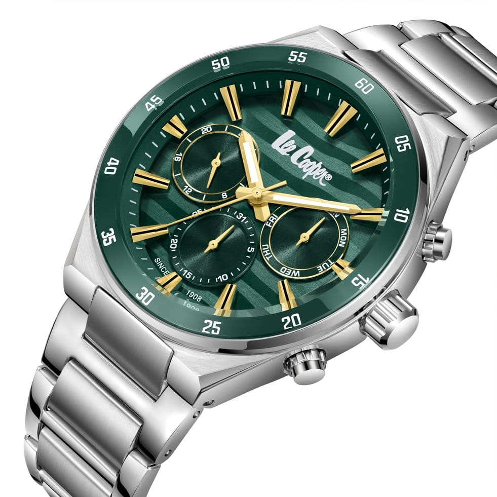 Мужские наручные часы Lee Cooper LC08175.370 оснащены кварцевым механизмом, обеспечивающий высокую точность хода и надежность. Элегантный корпус часов выполнен из суперметалла серебристого цвета, что делает их устойчивыми к внешним воздействиям и придает благородный вид. Циферблат украшен классическими стрелками с люминесцентным покрытиемЛюминесцентное покрытиеПозволяет считывать показания времени в темноте. Производители наносят на стрелки, часовые индексы, безель или поверхность циферблата светонакопительный состав, дающий холодное свечение., гармонично дополняющим общий дизайн модели. Для защиты циферблата используется минеральное стеклоМинеральное стеклоМинеральное стекло представляет собой искусственно выращенный минерал кварца. Такое стекло отличается особой устойчивостью к повреждениям и царапинам. Уступает по некоторым качествам сапфировому стеклу., устойчивое к царапинам и механическим повреждениям. Неподвижный безельБезельВнешний ободок, закрепляющий стекло. В спортивных часах так называется поворотное кольцо с делениями на циферблате, выполняет роль таймера – замеряет отрезки времени на шкале. Неподвижный безель – элемент декора. Однонаправленно вращающийся безель на дайверских часах позволяет фиксировать моменты погружения и выныривания на поверхность. с IP-покрытиемIP-покрытиеМетод ионного напыления. Демонстрирует повышенную устойчивость к истиранию, окислению и химическим веществам. Под воздействием высокого давления и температуры около 1500°C молекулы металла надёжно соединяются с частицами корпуса часов. зеленого цвета. Корпус имеет круглую форму диаметром 43 мм, что делает часы заметными и подходящими. Браслет из стали оснащен раскладной застёжкойРаскладная застёжкаТакой тип застёжки используется только на браслетах из металла. Она никогда не раскрывается полностью, происходит разделение на 2 и более частей. Раскладывающая застёжка снизит вероятность потери часов к минимуму., обеспечивающим комфортное и безопасное ношение. Вынесенный циферблат с 24-х часовым указателем времени, индикацией даты и дня недели. Часы обладают водонепроницаемостью до 50 метров (5 АТМ), что позволяет использовать их в повседневной жизни, включая контакт с водой при мытье рук или дожде. Эти часы станут идеальным выбором для мужчин, ценящих стиль, качество и функциональность.