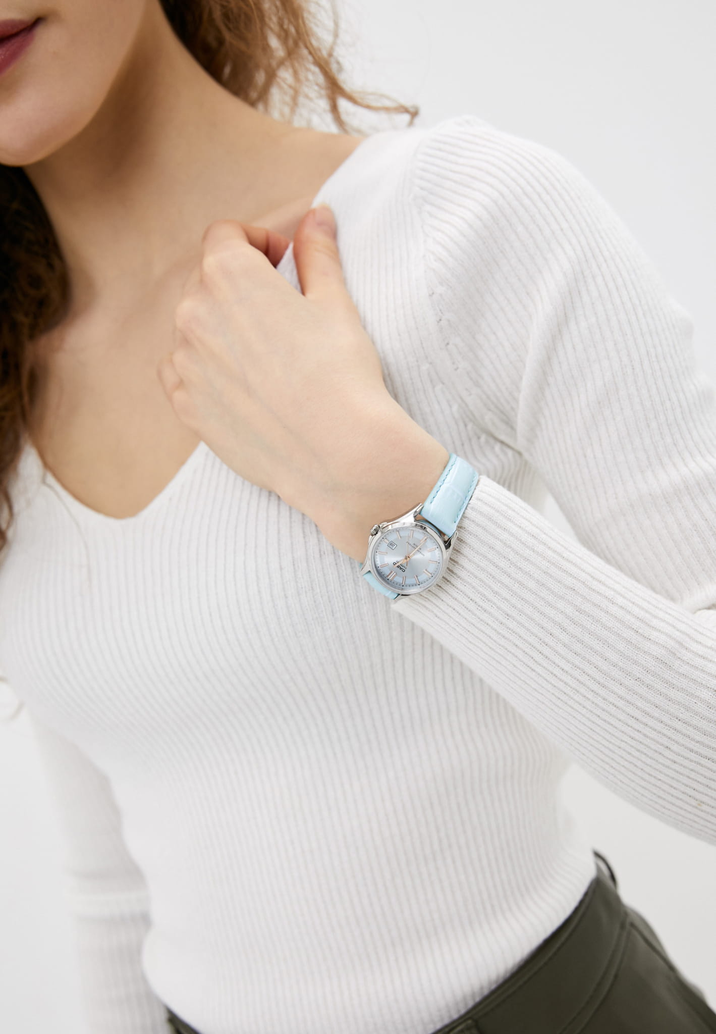Наручные часы в классическом стиле подойдут в качестве элегантного и полезного аксессуара на любой случай жизни. Аккуратный круглый корпус выполнен из нержавеющей стали. Кожаный ремешок нежно-голубого цвета будет элегантно обрамлять запястье и подчеркнет женственность обладательницы аксессуара. Полезной особенностью часов является отображение текущей даты на дисплее. Подсветка NeobriteПодсветка NeobriteИспользование светонакопительных составов на основе сульфида цинка или алюмината стронция, яркий свет можно наблюдать на протяжении 6-10 часов после «зарядки» часов около источника света. позволяет аксессуару длительно светиться даже после непродолжительного нахождения на свету. Тип механизма - кварцевый. Батарейка имеет большой срок службы размером в 10 лет. Водонепроницаемость часов равна 5 Барам.