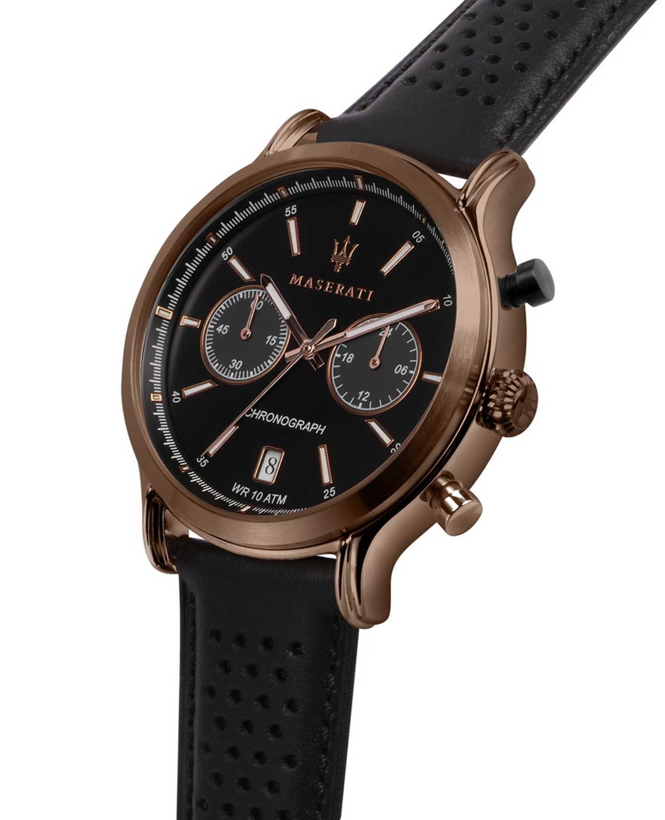 Мужские итальянские часы-хронографХронографФункция позволяет измерять отрезки времени с особой точностью: часы, минуты, секунды. Верным признаком хронографа является наличие на циферблате 3 дополнительных окошек-счётчиков. Maserati Legend R8871638001, кварцевый механизм с высокой точностью. Корпус часов изготовлен из стали с PVD-покрытиемPVDУльтратонкое покрытие наносится в технике вакуумного напыления, сочетает в себе нитрид титана особой прочности со слоем золота или оксида хрома. Несёт в себе декоративную или защитную функцию.. Стрелки с люминесцентным покрытиемЛюминесцентное покрытиеПозволяет считывать показания времени в темноте. Производители наносят на стрелки, часовые индексы, безель или поверхность циферблата светонакопительный состав, дающий холодное свечение.. Класс водозащиты: 100 метров, позволит плавать, нырять и заниматься другими водными видами спорта. Кожаный ремешок на стандартной застежке.
