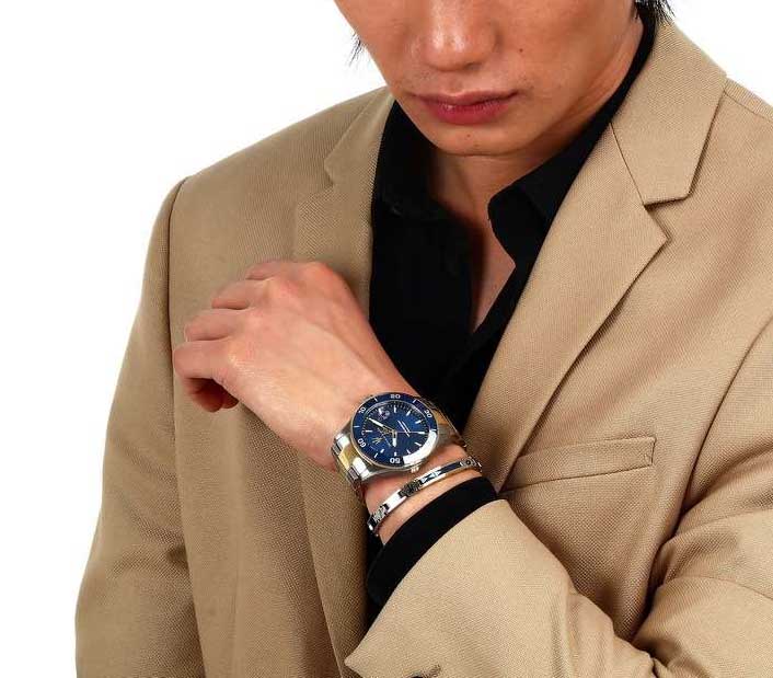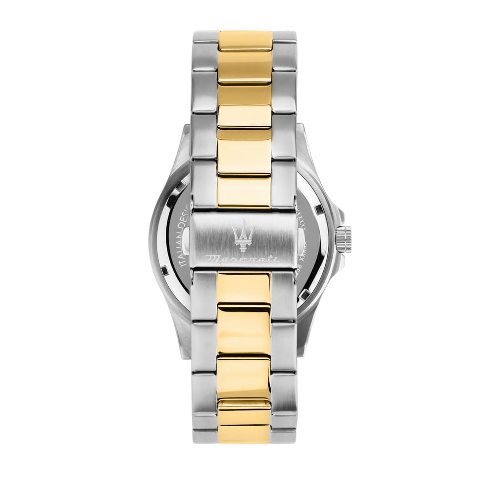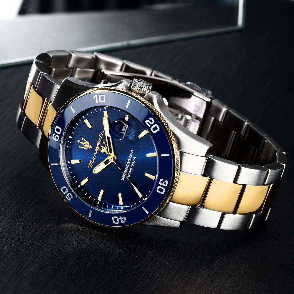 Мужские часы Maserati R8873600007 — это стильное сочетание элегантности и современного дизайна. Корпус из нержавеющей стали с диаметром 43 мм идеально сбалансирован и элегантен. Минеральное стеклоМинеральное стеклоМинеральное стекло представляет собой искусственно выращенный минерал кварца. Такое стекло отличается особой устойчивостью к повреждениям и царапинам. Уступает по некоторым качествам сапфировому стеклу. защищает циферблат от царапин. Стальной браслет на застёжке-бабочке с кнопкамиЗастёжка "бабочка"Такой вид застёжки дополняется предохранителями, помогающими избежать случайного раскрытия браслета. Обладают изящным исполнением. идеально дополняют дизайн часов, обеспечивая комфортное ношение. Стрелки и метки с люминесцентным покрытиемЛюминесцентное покрытиеПозволяет считывать показания времени в темноте. Производители наносят на стрелки, часовые индексы, безель или поверхность циферблата светонакопительный состав, дающий холодное свечение.. БезельБезельВнешний ободок, закрепляющий стекло. В спортивных часах так называется поворотное кольцо с делениями на циферблате, выполняет роль таймера – замеряет отрезки времени на шкале. Неподвижный безель – элемент декора. Однонаправленно вращающийся безель на дайверских часах позволяет фиксировать моменты погружения и выныривания на поверхность. с керамической вставкой. Часы обладают впечатляющей водонепроницаемостью до 10 бар (100 метров), что делает их идеальными для повседневной носки. Метки в виде штрихов. Окошко даты с увеличительным стеклом находится в положении 3 часа. Данная модель идёт в комплекте с мужским браслетом из гипоаллергенной нержавеющей стали и частичным PVD-покрытиемPVDУльтратонкое покрытие наносится в технике вакуумного напыления, сочетает в себе нитрид титана особой прочности со слоем золота или оксида хрома. Несёт в себе декоративную или защитную функцию..