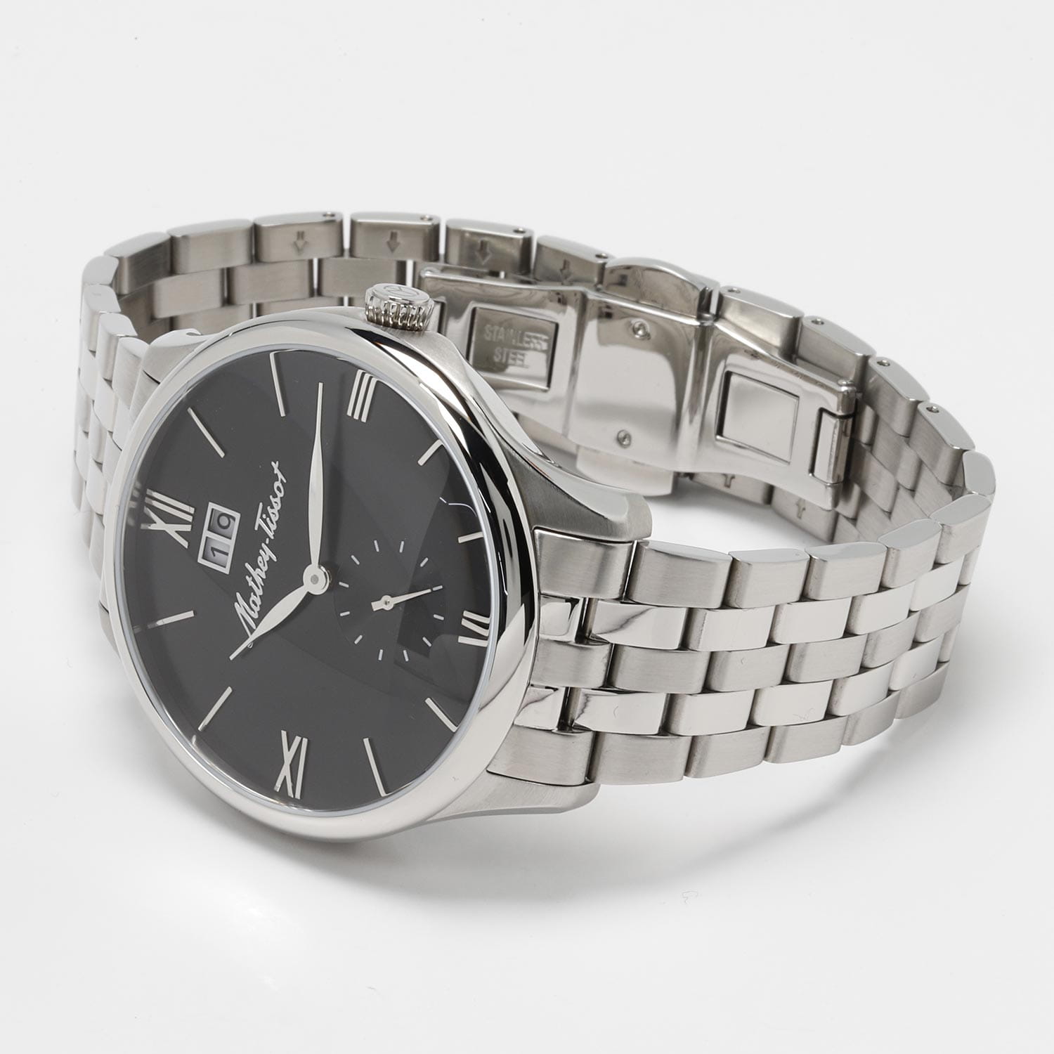 Мужские кварцевые часы Mathey-Tissot Edmond Metal H1886MAN — это стильное сочетание элегантности и современного дизайна. Изящный корпус выполнен из нержавеющей стали, диаметром 42 мм, что придаст образу элегантности и надежности. Изысканный циферблат с метками в виде штрихов и римских цифр придает модели особый блеск. Циферблат защищен минеральным стекломМинеральное стеклоМинеральное стекло представляет собой искусственно выращенный минерал кварца. Такое стекло отличается особой устойчивостью к повреждениям и царапинам. Уступает по некоторым качествам сапфировому стеклу. с сапфировым покрытием, обеспечивает устойчивость к царапинам. Окошко даты находится в положении 12 часов. Стальной браслет на застёжке-бабочке с кнопкамиЗастёжка "бабочка"Такой вид застёжки дополняется предохранителями, помогающими избежать случайного раскрытия браслета. Обладают изящным исполнением. , гарантирует комфортное и безопасное ношение. Секундная стрелка вынесена на отдельный циферблат. Рифленая заводная головка. Класс водозащиты: 50 метров позволит защитить корпус от случайных брызг или капель дождя. Mathey-Tissot — отличный выбор для тех, кто ценит утонченность и качество.