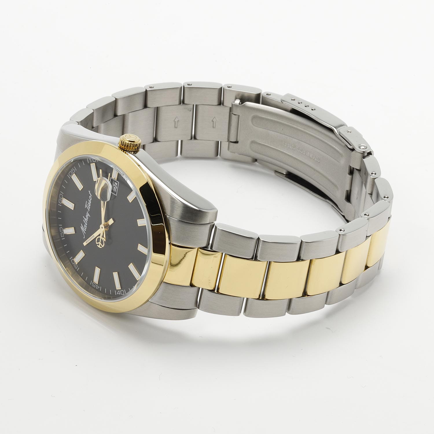 Мужские кварцевые часы Mathey-Tissot Mathy H450BN — это стильное сочетание элегантности и современного дизайна. Изящный корпус выполнен из нержавеющей стали, диаметром 40 мм, что придаст образу элегантности и надежности. Изысканный циферблат с метками в виде штрихов придает модели особый блеск. Циферблат защищен минеральным стекломМинеральное стеклоМинеральное стекло представляет собой искусственно выращенный минерал кварца. Такое стекло отличается особой устойчивостью к повреждениям и царапинам. Уступает по некоторым качествам сапфировому стеклу., обеспечивает устойчивость к царапинам. Стрелки и метки с люминесцентным покрытиемЛюминесцентное покрытиеПозволяет считывать показания времени в темноте. Производители наносят на стрелки, часовые индексы, безель или поверхность циферблата светонакопительный состав, дающий холодное свечение.. БезельБезельВнешний ободок, закрепляющий стекло. В спортивных часах так называется поворотное кольцо с делениями на циферблате, выполняет роль таймера – замеряет отрезки времени на шкале. Неподвижный безель – элемент декора. Однонаправленно вращающийся безель на дайверских часах позволяет фиксировать моменты погружения и выныривания на поверхность. с PVD-покрытиемPVDУльтратонкое покрытие наносится в технике вакуумного напыления, сочетает в себе нитрид титана особой прочности со слоем золота или оксида хрома. Несёт в себе декоративную или защитную функцию. золотистого цвета. Окошко даты находится в положении 3 часа. Часы оснащены надежным кварцевым механизмом. Стальной браслет с частичным PVD-покрытиемPVDУльтратонкое покрытие наносится в технике вакуумного напыления, сочетает в себе нитрид титана особой прочности со слоем золота или оксида хрома. Несёт в себе декоративную или защитную функцию. на раскладной застёжке с фиксаторомРаскладная застёжкаТакой тип застёжки используется только на браслетах из металла. Она никогда не раскрывается полностью, происходит разделение на 2 и более частей. Раскладывающая застёжка снизит вероятность потери часов к минимуму., гарантирует комфортное и безопасное ношение. Рифленая заводная головка. Класс водозащиты: 50 метров позволит защитить корпус от случайных брызг или капель дождя. Mathey-Tissot  — отличный выбор для тех, кто ценит утонченность и качество.