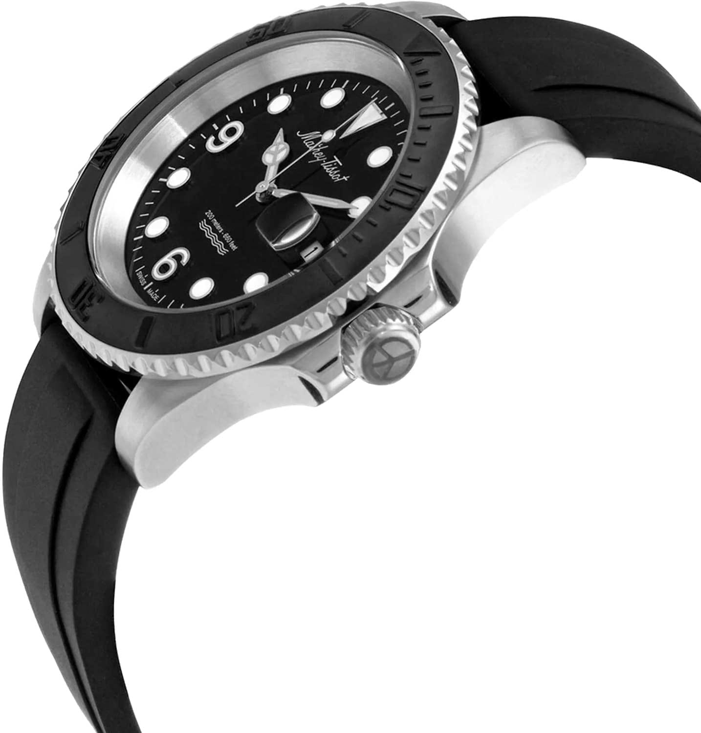 Мужские кварцевые часы Mathey-Tissot Mathy H909AN — это стильное сочетание элегантности и современного дизайна. Изящный корпус выполнен из нержавеющей стали, диаметром 42 мм, что придаст образу элегантности и надежности. Циферблат с метками в виде точек и арабских цифр придает модели особый блеск. Циферблат защищен минеральным стекломМинеральное стеклоМинеральное стекло представляет собой искусственно выращенный минерал кварца. Такое стекло отличается особой устойчивостью к повреждениям и царапинам. Уступает по некоторым качествам сапфировому стеклу. с сапфировым покрытием, обеспечивает устойчивость к царапинам. Стрелки и метки с люминесцентным покрытиемЛюминесцентное покрытиеПозволяет считывать показания времени в темноте. Производители наносят на стрелки, часовые индексы, безель или поверхность циферблата светонакопительный состав, дающий холодное свечение.. Окошко даты находится в положении 3 часа.  Вращающийся безельБезельВнешний ободок, закрепляющий стекло. В спортивных часах так называется поворотное кольцо с делениями на циферблате, выполняет роль таймера – замеряет отрезки времени на шкале. Неподвижный безель – элемент декора. Однонаправленно вращающийся безель на дайверских часах позволяет фиксировать моменты погружения и выныривания на поверхность. в одном направлении. Часы оснащены надежным кварцевым механизмом. Силиконовый ремешок с раскладной застёжкойРаскладная застёжкаТакой тип застёжки используется только на браслетах из металла. Она никогда не раскрывается полностью, происходит разделение на 2 и более частей. Раскладывающая застёжка снизит вероятность потери часов к минимуму. гарантирует комфортное и безопасное ношение. Класс водозащиты: 200 метров позволит плавать, нырять и заниматься другими водными видами спорта. Mathey-Tissot  — отличный выбор для тех, кто ценит утонченность и качество.