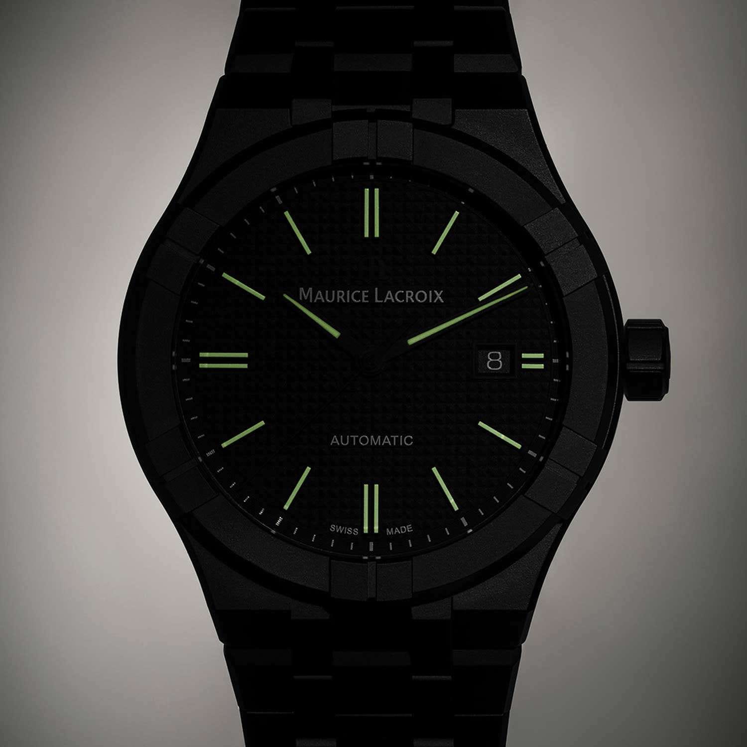 Швейцарские часы Maurice Lacroix Aikon Automatic AI6008-CRM22-330-2, воплощающие современный стиль и безупречное швейцарское качество. Керамический корпус и безельБезельВнешний ободок, закрепляющий стекло. В спортивных часах так называется поворотное кольцо с делениями на циферблате, выполняет роль таймера – замеряет отрезки времени на шкале. Неподвижный безель – элемент декора. Однонаправленно вращающийся безель на дайверских часах позволяет фиксировать моменты погружения и выныривания на поверхность. с эффектным дизайном из шести "когтей". Высота корпуса составляет всего 11 мм, что делает модель элегантной и удобной в ношении. Сапфировое стеклоСапфировое стеклоПрочный и надёжный материал из кристалла сапфира синтетического происхождения, характеризующийся особой твёрдостью и устойчивостью к царапинам и повреждениям. с двойным антибликовым покрытиемАнтибликовое покрытиеСлой оксида металла в 0,13-0,3 микрон, благодаря которому стекло часов не бликует и не отражает свет. Антибликовое покрытие уменьшает отражение света в 10 раз, обеспечивая отличную читаемость показателей циферблата. надежно защищает гильошированный черный циферблат с узором Clous de Paris. Стрелки и метки с люминесцентным покрытиемЛюминесцентное покрытиеПозволяет считывать показания времени в темноте. Производители наносят на стрелки, часовые индексы, безель или поверхность циферблата светонакопительный состав, дающий холодное свечение., что облегчает чтение времени даже в условиях слабого освещения. На 3 часах расположено окошко с указателем даты. Часы оснащены кварцевым механизмом, обеспечивающим точный ход. Водостойкость до 20 ATM позволяет не беспокоиться о воздействии воды в повседневной жизни. Часы комплектуются керамическим браслетом с застежкой «бабочка»Застёжка "бабочка"Такой вид застёжки дополняется предохранителями, помогающими избежать случайного раскрытия браслета. Обладают изящным исполнением. , раскладывающаяся при нажатии кнопок двойной блокировки и гравировкой Maurice Lacroix завершают образ, обеспечивая удобство и стиль.
