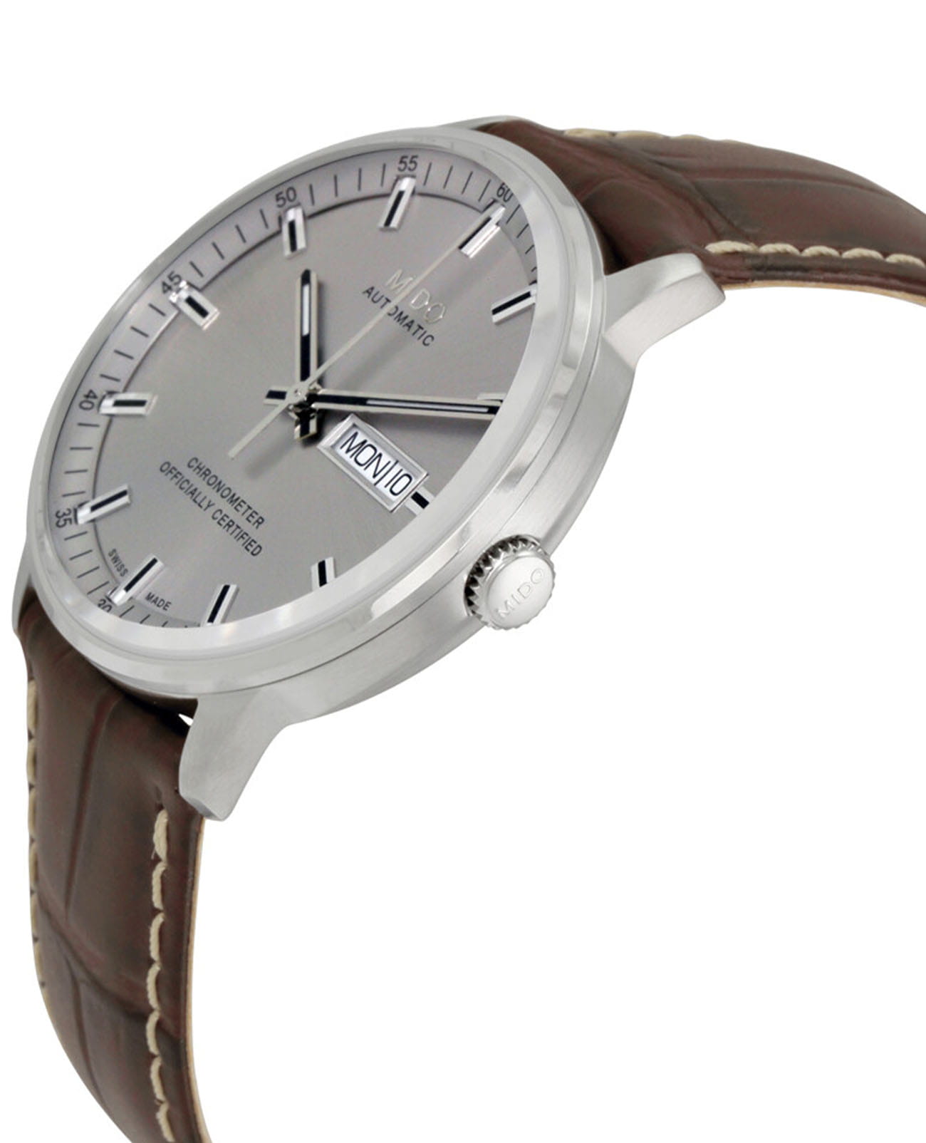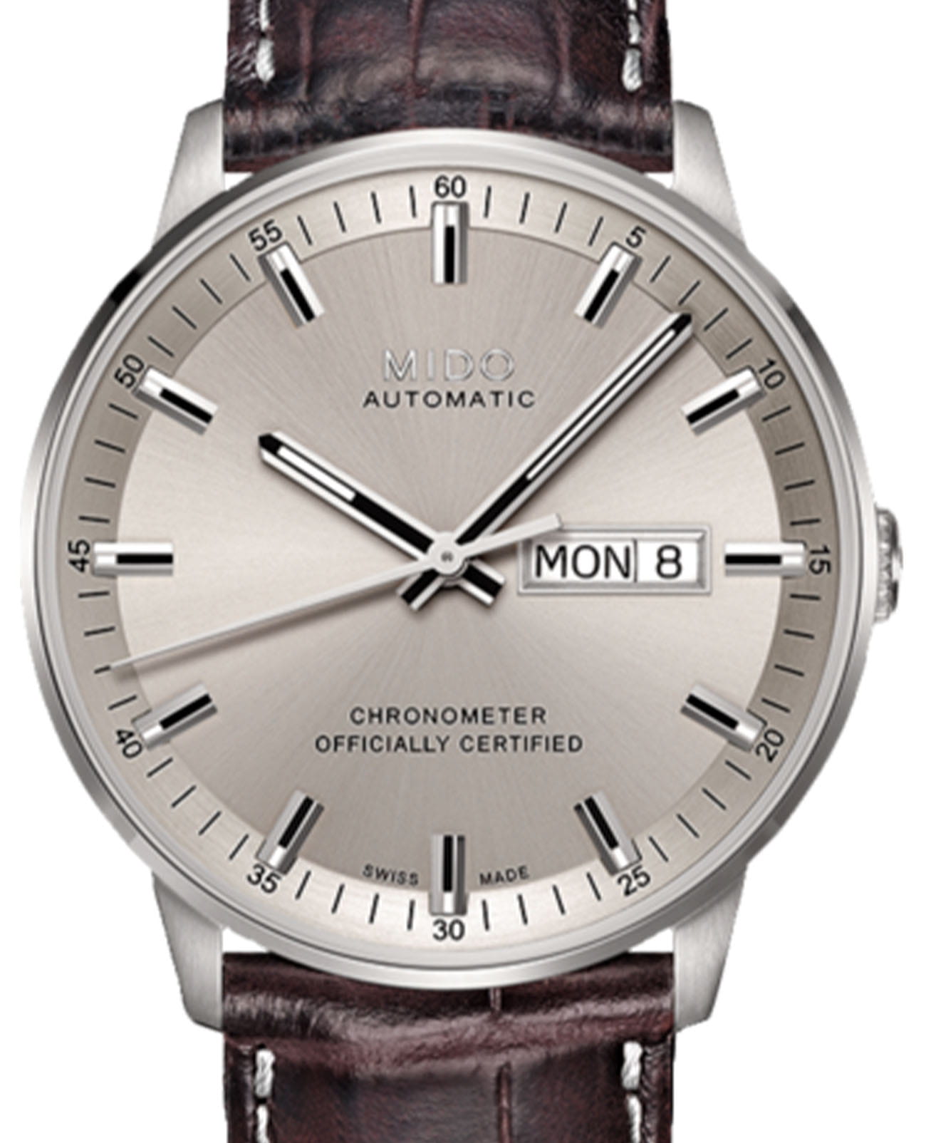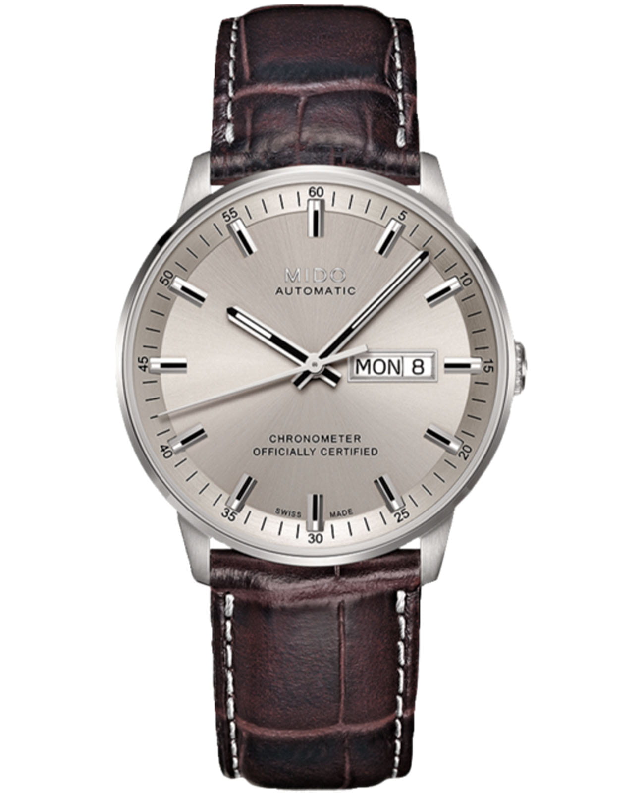 Мужские швейцарские механические часы Mido Commander Chronometer M021.431.16.071.00, механический механизм Mido Powermatic 80 (ETA C07.621) (автоматический калибр) с высокой точностью. Сапфировое стеклоСапфировое стеклоПрочный и надёжный материал из кристалла сапфира синтетического происхождения, характеризующийся особой твёрдостью и устойчивостью к царапинам и повреждениям. устойчивое к появлению царапин, обладающее высокой прозрачностью. Класс водозащиты: 50 метров, позволит защитить корпус от случайных брызг или капель дождя. Корпус часов изготовлен из стали и коричневый кожаный ремешок. Отображение дня недели и даты в положении «3 часа». Стрелки и метки с люминесцентным покрытиемЛюминесцентное покрытиеПозволяет считывать показания времени в темноте. Производители наносят на стрелки, часовые индексы, безель или поверхность циферблата светонакопительный состав, дающий холодное свечение..