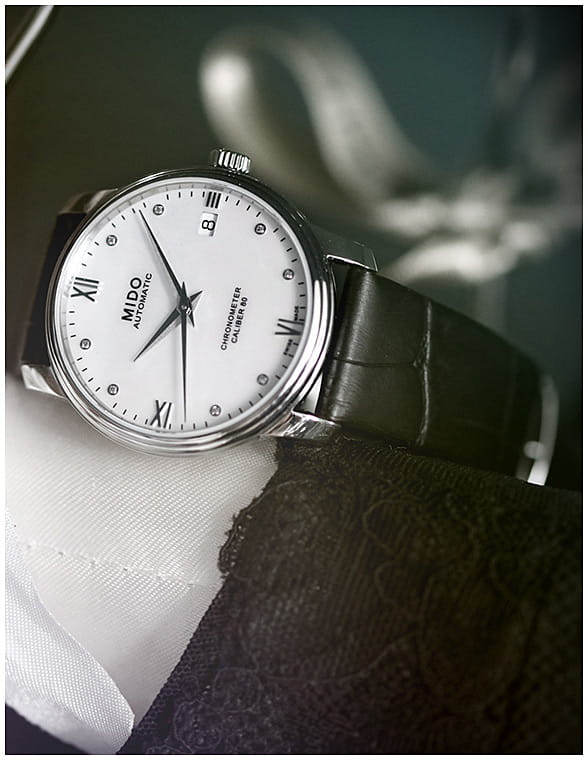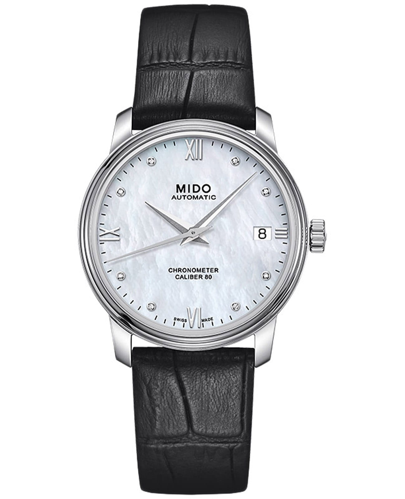 Стильная модель для прекрасной половины. Циферблат украшен 8 бриллиантами. Механический механизм (автоматический калибр) с высокой точностью. Сапфировое стеклоСапфировое стеклоПрочный и надёжный материал из кристалла сапфира синтетического происхождения, характеризующийся особой твёрдостью и устойчивостью к царапинам и повреждениям. устойчивое к появлению царапин, обладающее высокой прозрачностью. Класс водозащиты: 30 метров, позволит защитить корпус от случайных брызг или капель дождя. Корпус часов изготовлен из нержавеющей стали. Кожаный ремешок с раскладной застёжкойРаскладная застёжкаТакой тип застёжки используется только на браслетах из металла. Она никогда не раскрывается полностью, происходит разделение на 2 и более частей. Раскладывающая застёжка снизит вероятность потери часов к минимуму.. Отображение даты в положении «3 часов».