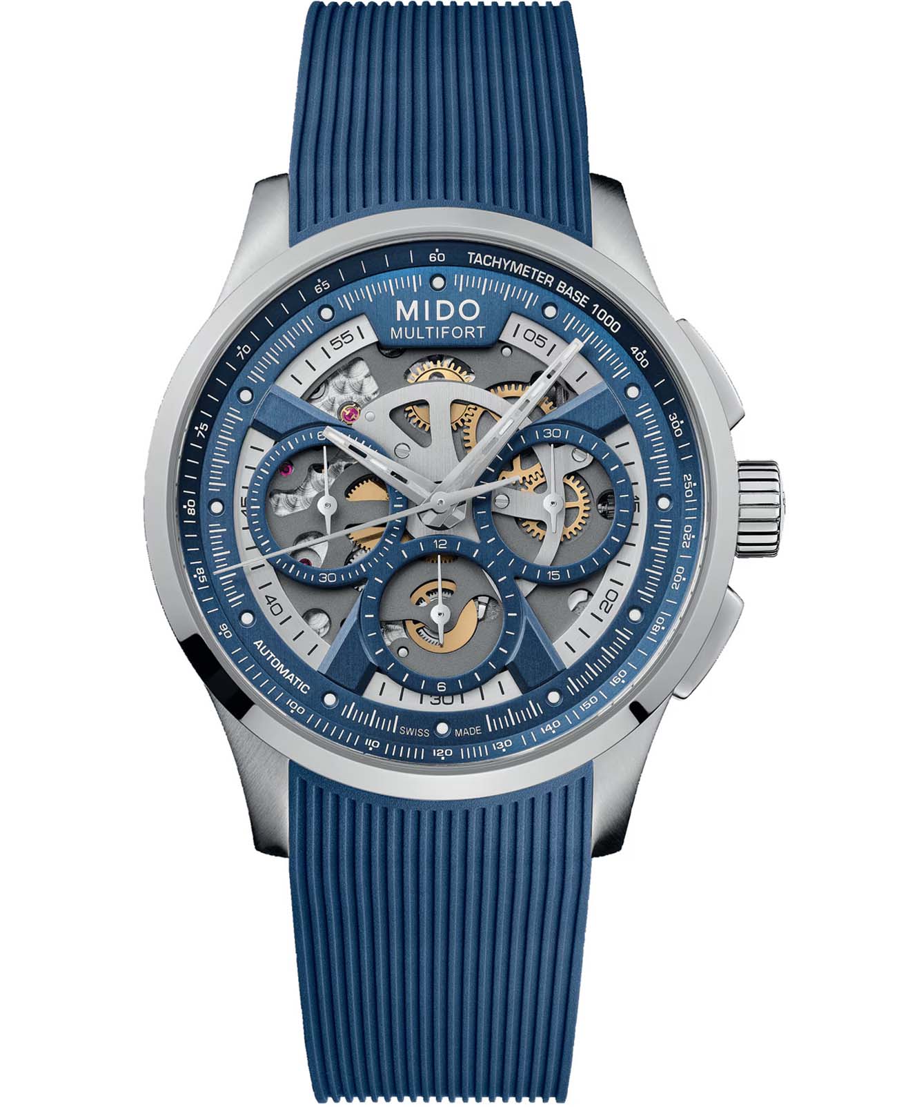 Швейцарские мужские наручные часы Mido Multifort Skeleton Chronograph M038.662.17.040.00, механический механизм с высокой точностью. Циферблат c сапфировым стекломСапфировое стеклоПрочный и надёжный материал из кристалла сапфира синтетического происхождения, характеризующийся особой твёрдостью и устойчивостью к царапинам и повреждениям., устойчивым к появлению царапин и обладающее высокой прозрачностью. Класс водозащиты: 100 метров, позволит плавать, нырять и заниматься другими водными видами спорта. Часы оснащены люминесцентным покрытиемЛюминесцентное покрытиеПозволяет считывать показания времени в темноте. Производители наносят на стрелки, часовые индексы, безель или поверхность циферблата светонакопительный состав, дающий холодное свечение., обеспечивающим отличную видимость даже при слабом освещении. Корпус часов изготовлен из стали. Часы с балансом из Nivachron™Nivachron™Специально разработанный инновационный сплав Nivachron™ повышает устойчивость часов к воздействию магнитных полей., обеспечивающим высокую устойчивость к магнитным полям и ударам. Часы с функциями хронографаХронографФункция позволяет измерять отрезки времени с особой точностью: часы, минуты, секунды. Верным признаком хронографа является наличие на циферблате 3 дополнительных окошек-счётчиков. и тахиметраТахиметрРазмеченная шкала, располагается на ободке или безеле часов. Тахиметр позволяет рассчитать скорость на определённом участке пути, расстояние измеряется в километрах или милях.. Каучуковый ремешок синего цвета со стандартной застежкой обеспечивает комфортное ношение.