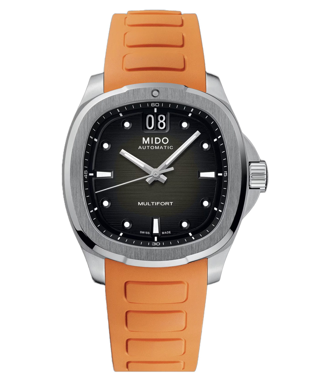 Мужские механические швейцарские часы Mido Multifort TV Big Date M049.526.17.081.00, механический механизм (автоматический калибр) с высокой точностью. Сапфировое стеклоСапфировое стеклоПрочный и надёжный материал из кристалла сапфира синтетического происхождения, характеризующийся особой твёрдостью и устойчивостью к царапинам и повреждениям. устойчивое к появлению царапин, обладающее высокой прозрачностью. Корпус часов изготовлен из нержавеющей стали в форме телевизора, столь же впечатляющий, сколь и точный, благодаря своему мощному механическому механизму. Современный и динамичный дизайн этих швейцарских часов подчеркивается ярким горизонтальным циферблатом с матовой отделкой, а также их отличительной функцией: большой датой в положении 12 часов. Стрелки с люминесцентным покрытиемЛюминесцентное покрытиеПозволяет считывать показания времени в темноте. Производители наносят на стрелки, часовые индексы, безель или поверхность циферблата светонакопительный состав, дающий холодное свечение.. Мощный автоматический механизм последнего поколения Calibre 80 оснащен высокотехнологичной балансировочной пружиной Nivachron ™ , которая обеспечивает исключительную устойчивость к ударам и магнитным полям. Класс водозащиты: 100 метров, позволит плавать, нырять и заниматься другими водными видами спорта. Каучуковый ремешок на стандартной застежке.