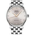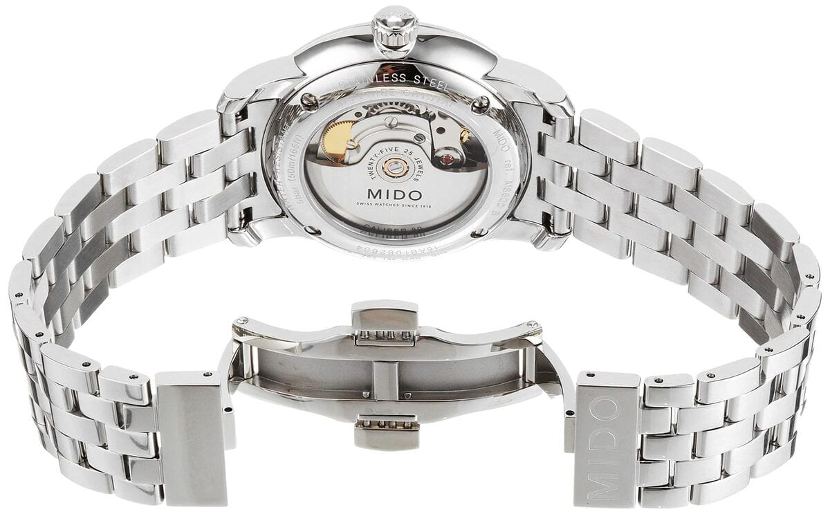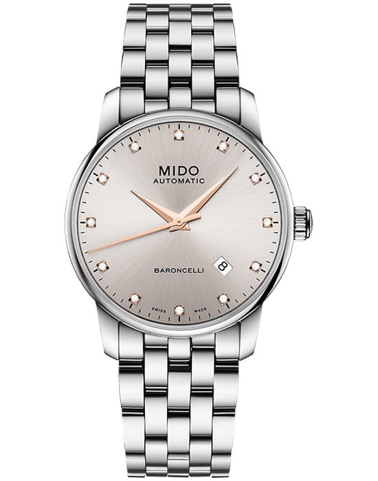 Mido Baroncelli M8600.4.26.1 — элегантная модель, сочетающая классику и современную швейцарскую инженерию. Корпус диаметром 38 мм изготовлен из нержавеющей стали и дополнен браслетом в пять рядов, снабжённым раскладной застёжкойРаскладная застёжкаТакой тип застёжки используется только на браслетах из металла. Она никогда не раскрывается полностью, происходит разделение на 2 и более частей. Раскладывающая застёжка снизит вероятность потери часов к минимуму. для удобства и надежности фиксации. Циферблат декорирован двенадцатью бриллиантами в качестве часовых меток, что придаёт часам утончённость и ювелирный блеск.