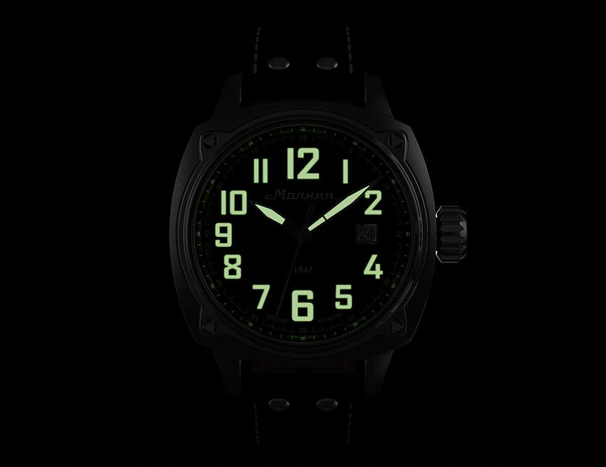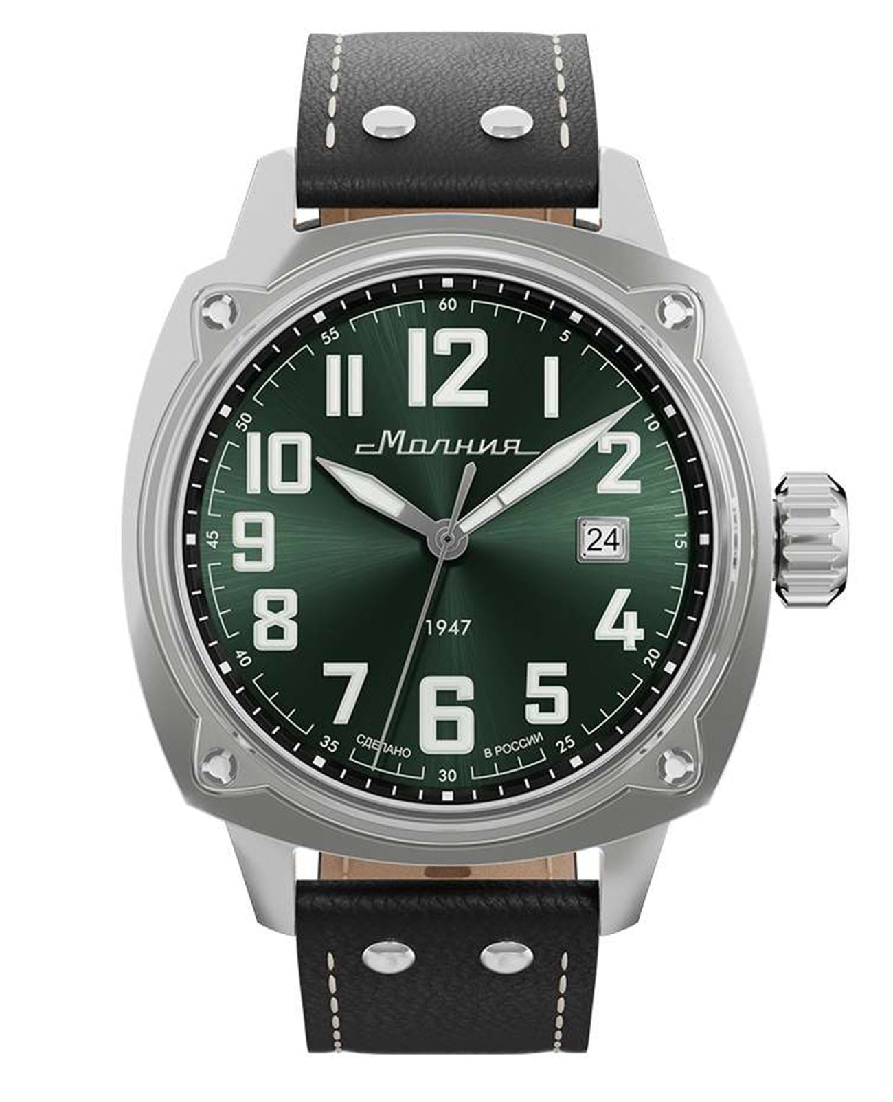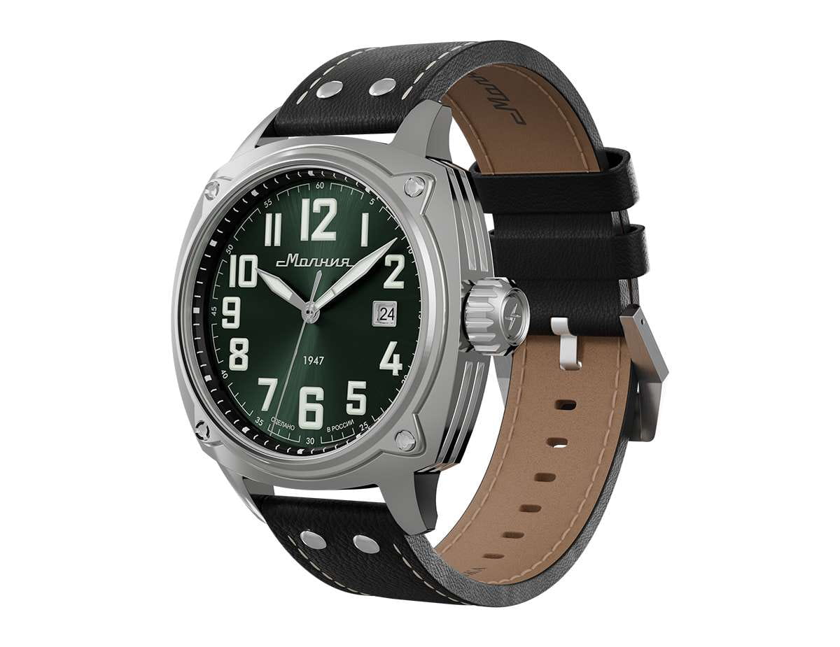 Мужские механические часы с автоподзаводом — это надёжный аксессуар от легендарного бренда «МОЛНИЯ», созданный на Челябинском часовом заводе. Корпус диаметром 42 мм выполнен из нержавеющей стали 316L с зеркальной полировкой. БезельБезельВнешний ободок, закрепляющий стекло. В спортивных часах так называется поворотное кольцо с делениями на циферблате, выполняет роль таймера – замеряет отрезки времени на шкале. Неподвижный безель – элемент декора. Однонаправленно вращающийся безель на дайверских часах позволяет фиксировать моменты погружения и выныривания на поверхность. также выполнен из стали с зеркальной отделкой. Циферблат зелёного цвета оформлен индексами и стрелками. Окошко даты расположено в положении 3 часов. Стрелки и метки с люминесцентным покрытиемЛюминесцентное покрытиеПозволяет считывать показания времени в темноте. Производители наносят на стрелки, часовые индексы, безель или поверхность циферблата светонакопительный состав, дающий холодное свечение. Super-LumiNova, обеспечивающим хорошую читаемость в темноте. Циферблат защищён сапфировым стекломСапфировое стеклоПрочный и надёжный материал из кристалла сапфира синтетического происхождения, характеризующийся особой твёрдостью и устойчивостью к царапинам и повреждениям. с антибликовым покрытиемАнтибликовое покрытиеСлой оксида металла в 0,13-0,3 микрон, благодаря которому стекло часов не бликует и не отражает свет. Антибликовое покрытие уменьшает отражение света в 10 раз, обеспечивая отличную читаемость показателей циферблата.. Механизм — японский автоматический калибр Miyota 8215 с функцией и запасом хода до 42 часов. Прозрачная задняя крышка позволяет наблюдать за работой механизма. Часы оснащены кожаным ремешком чёрного цвета с белой отстрочкой и классической пряжкой. Водонепроницаемость 100 м позволяет использовать часы для плавания и повседневного ношения. Идеальный выбор для тех, кто ценит качество, точность и стиль.