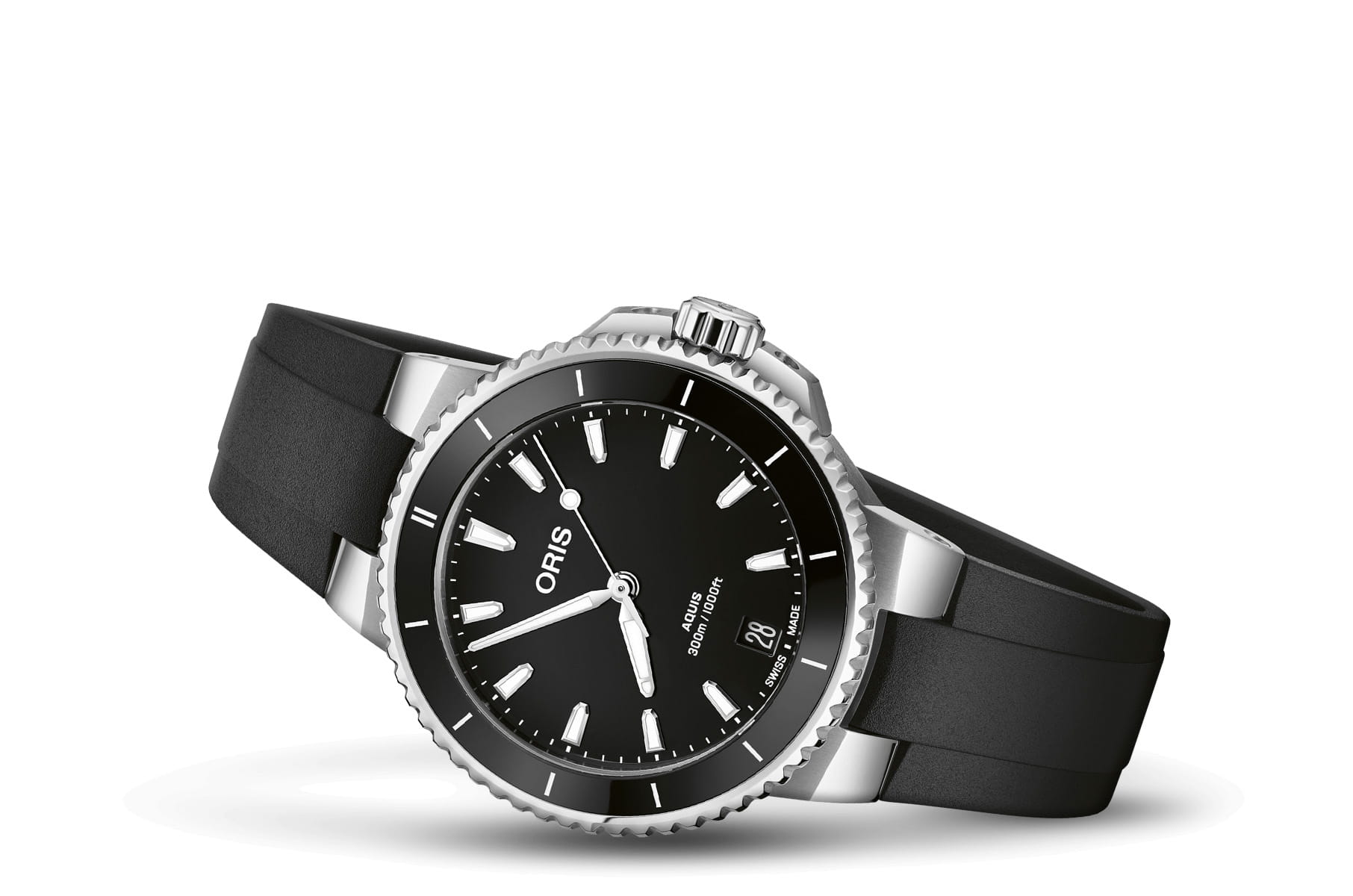 Компания Oris оснастила универсальную модель Aquis Date 36,50 мм спортивным, но элегантным корпусом из нержавеющей стали, надежным автоматическим механизмом Swiss Made, водонепроницаемостью до 30 бар (300 метров) и сменными ремешками. Результат? Прекрасные высокопроизводительные часы.
