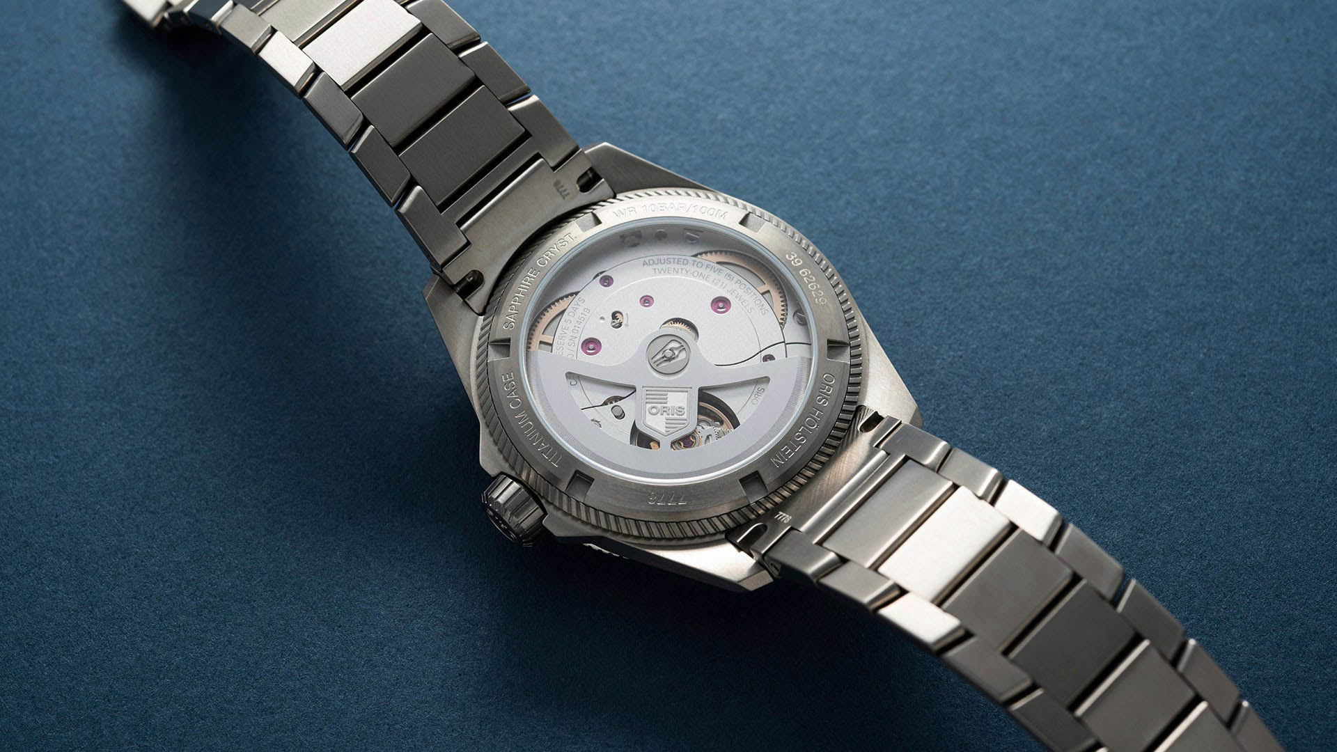 Многокомпонентный корпус из титана. Сапфировое стеклоСапфировое стеклоПрочный и надёжный материал из кристалла сапфира синтетического происхождения, характеризующийся особой твёрдостью и устойчивостью к царапинам и повреждениям., выпуклое с обеих сторон, внутреннее антибликовое покрытие. Нержавеющая сталь, завинчивающаяся прозрачная задняя крышка из минерального стеклаМинеральное стеклоМинеральное стекло представляет собой искусственно выращенный минерал кварца. Такое стекло отличается особой устойчивостью к повреждениям и царапинам. Уступает по некоторым качествам сапфировому стеклу.. Стрелки с люминесцентным покрытиемЛюминесцентное покрытиеПозволяет считывать показания времени в темноте. Производители наносят на стрелки, часовые индексы, безель или поверхность циферблата светонакопительный состав, дающий холодное свечение..