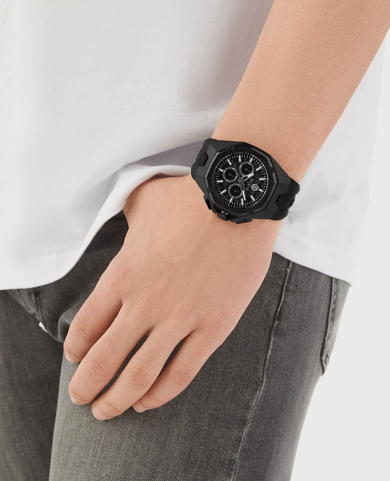 Мужские часы c хронографомХронографФункция позволяет измерять отрезки времени с особой точностью: часы, минуты, секунды. Верным признаком хронографа является наличие на циферблате 3 дополнительных окошек-счётчиков. Philipp Plein Octagon PWTBA0623, кварцевый механизм с высокой точностью. Класс водозащиты: 50 метров, позволит защитить корпус от случайных брызг или капель дождя. Корпус часов изготовлен из нержавеющей стали с IP-покрытиемIP-покрытиеМетод ионного напыления. Демонстрирует повышенную устойчивость к истиранию, окислению и химическим веществам. Под воздействием высокого давления и температуры около 1500°C молекулы металла надёжно соединяются с частицами корпуса часов.. Стрелки и метки с люминесцентным покрытиемЛюминесцентное покрытиеПозволяет считывать показания времени в темноте. Производители наносят на стрелки, часовые индексы, безель или поверхность циферблата светонакопительный состав, дающий холодное свечение.. 12 и 24-часовой формат времени. Минеральное стеклоМинеральное стеклоМинеральное стекло представляет собой искусственно выращенный минерал кварца. Такое стекло отличается особой устойчивостью к повреждениям и царапинам. Уступает по некоторым качествам сапфировому стеклу. устойчивое к мелким механическим повреждениям.