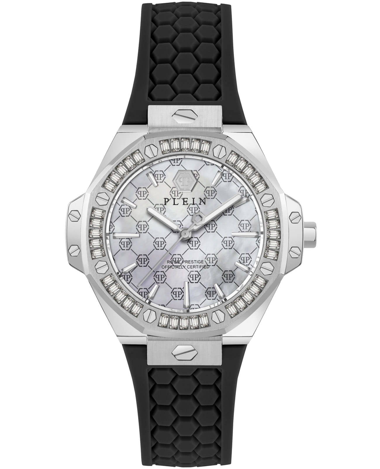Женские кварцевые часы Philipp Plein Plein Royal Prestige PW4FA0325 — это стильное сочетание элегантности и современного дизайна. Изящный корпус выполнен из нержавеющей стали серебристого цвета, диаметром 33 мм, что придаст образу женственности и романтизма. Изысканный циферблат с метками в виде штрихов придает модели особый блеск. Циферблат защищен минеральным стекломМинеральное стеклоМинеральное стекло представляет собой искусственно выращенный минерал кварца. Такое стекло отличается особой устойчивостью к повреждениям и царапинам. Уступает по некоторым качествам сапфировому стеклу., обеспечивающий устойчивость к царапинам. БезельБезельВнешний ободок, закрепляющий стекло. В спортивных часах так называется поворотное кольцо с делениями на циферблате, выполняет роль таймера – замеряет отрезки времени на шкале. Неподвижный безель – элемент декора. Однонаправленно вращающийся безель на дайверских часах позволяет фиксировать моменты погружения и выныривания на поверхность. инкрустирован кристаллами. Стрелки с люминесцентным покрытиемЛюминесцентное покрытиеПозволяет считывать показания времени в темноте. Производители наносят на стрелки, часовые индексы, безель или поверхность циферблата светонакопительный состав, дающий холодное свечение.. Часы оснащены надежным кварцевым механизмом. Силиконовый ремешок на стандартной застёжке, гарантирует комфортное и безопасное ношение. Класс водозащиты: 50 метров позволит защитить корпус от случайных брызг или капель дождя. Phlipp Plein — отличный выбор для тех, кто ценит яркость и качество.