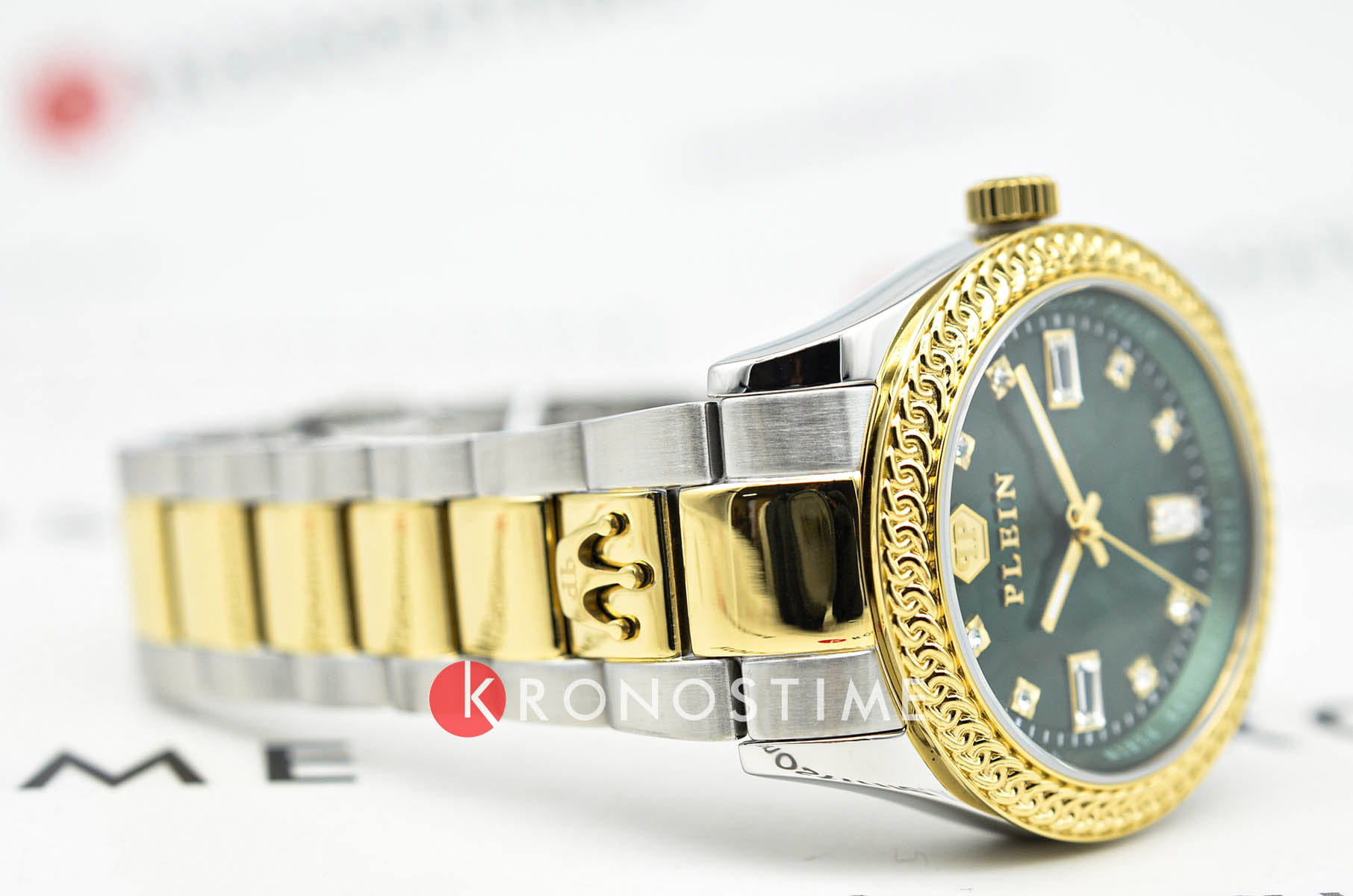 ​​Часы Philipp Plein PWCDA0524 из коллекции Queen сочетают элегантность и функциональность.​​ ​​Корпус диаметром 38 мм выполнен из нержавеющей стали, придающим изделию роскошный вид.​​ ​​Зеленый циферблат украшен фирменным логотипом бренда в виде черепа на отметке 12 часов.​​ ​​ БезельБезельВнешний ободок, закрепляющий стекло. В спортивных часах так называется поворотное кольцо с делениями на циферблате, выполняет роль таймера – замеряет отрезки времени на шкале. Неподвижный безель – элемент декора. Однонаправленно вращающийся безель на дайверских часах позволяет фиксировать моменты погружения и выныривания на поверхность. с IP-покрытиемIP-покрытиеМетод ионного напыления. Демонстрирует повышенную устойчивость к истиранию, окислению и химическим веществам. Под воздействием высокого давления и температуры около 1500°C молекулы металла надёжно соединяются с частицами корпуса часов..
