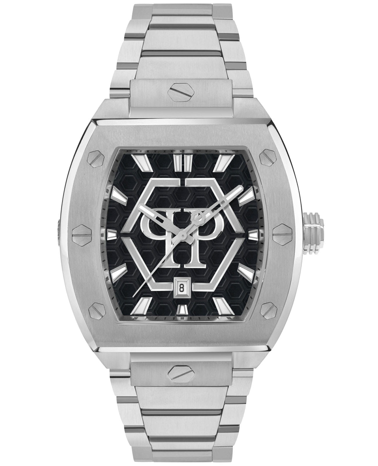 Philipp Plein Hexagon Phantom PWPUA0725 - часы в современном дизайне несомненно добавят вам выразительности и станут главным акцентом вашего стильного образа. Мужские кварцевые часы с высокой точностью. Стальной корпус серебристого цвета, диаметром 44 мм. Циферблат декорирован логотипом бренда, метки в виде штрихов. Минеральное стеклоМинеральное стеклоМинеральное стекло представляет собой искусственно выращенный минерал кварца. Такое стекло отличается особой устойчивостью к повреждениям и царапинам. Уступает по некоторым качествам сапфировому стеклу. защищает циферблат от царапин. Люминесцентное покрытиеЛюминесцентное покрытиеПозволяет считывать показания времени в темноте. Производители наносят на стрелки, часовые индексы, безель или поверхность циферблата светонакопительный состав, дающий холодное свечение. стрелок и меток позволит следить за временем даже в полной темноте. Окошко даты находится в положении 6 часов. Стальной браслет на застёжке-бабочке с кнопкамиЗастёжка "бабочка"Такой вид застёжки дополняется предохранителями, помогающими избежать случайного раскрытия браслета. Обладают изящным исполнением. , обеспечивает комфортное ношение. Граненая заводная головка. Влагозащита: 50 метров, позволит защитить корпус от случайных брызг или капель дождя. Идеальный аксессуар для тех, кто ценит индивидуальность и не боится выделяться из толпы.