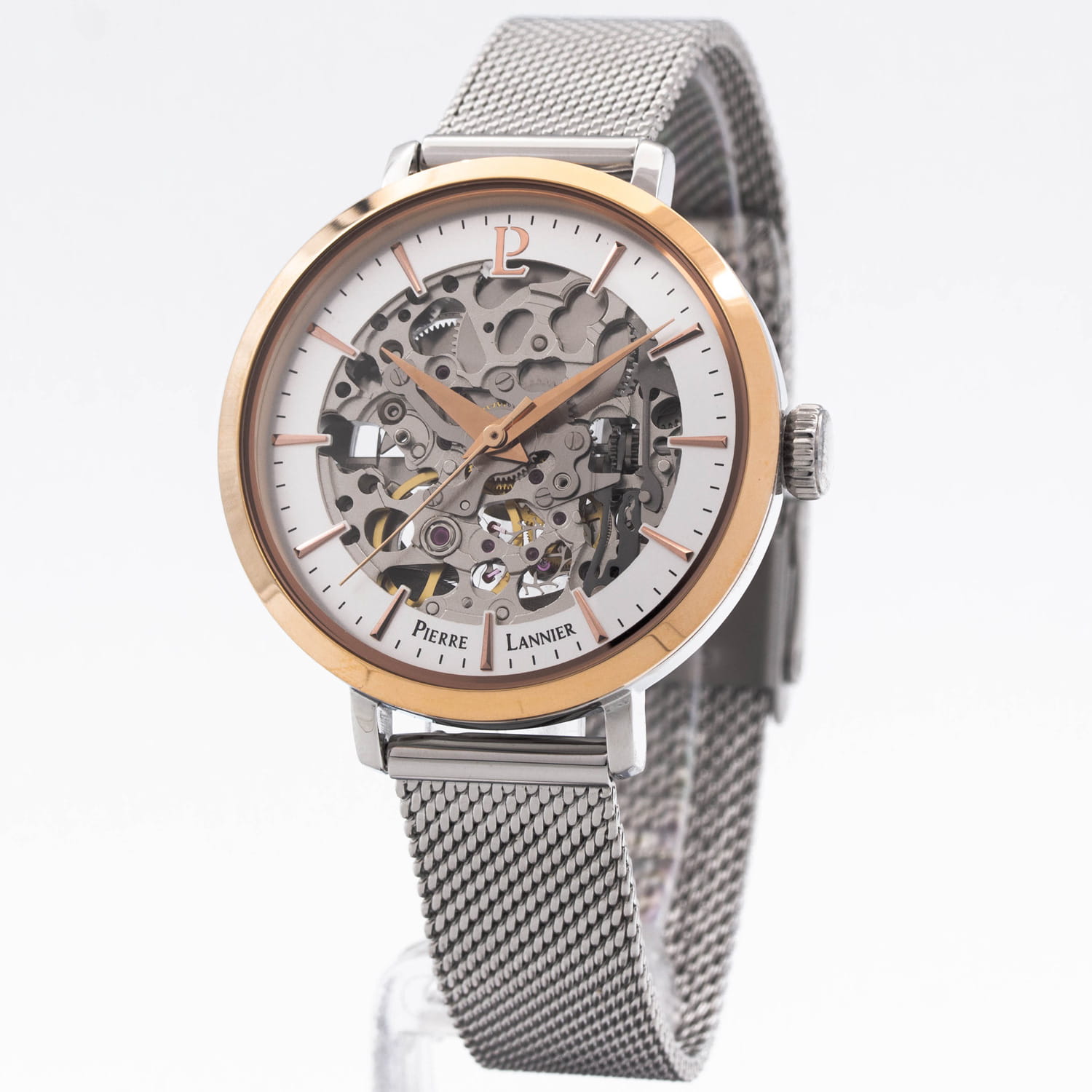 Женские механические часы с автоподзаводом Pierre Lannier Automatic 312B628. Минеральное стеклоМинеральное стеклоМинеральное стекло представляет собой искусственно выращенный минерал кварца. Такое стекло отличается особой устойчивостью к повреждениям и царапинам. Уступает по некоторым качествам сапфировому стеклу. устойчивое к мелким механическим повреждениям. Скелетонизированный серебристый циферблат. Центральные часовая, минутная и секундная стрелки. Корпус выполнен из полированной нержавеющей стали . Неподвижный безельБезельВнешний ободок, закрепляющий стекло. В спортивных часах так называется поворотное кольцо с делениями на циферблате, выполняет роль таймера – замеряет отрезки времени на шкале. Неподвижный безель – элемент декора. Однонаправленно вращающийся безель на дайверских часах позволяет фиксировать моменты погружения и выныривания на поверхность. из нержавеющей стали с IP-покрытиемIP-покрытиеМетод ионного напыления. Демонстрирует повышенную устойчивость к истиранию, окислению и химическим веществам. Под воздействием высокого давления и температуры около 1500°C молекулы металла надёжно соединяются с частицами корпуса часов. . Водостойкость: 30 метров, позволит защитить корпус от случайных брызг или капель дождя. Стальной браслет на раскладной застёжкеРаскладная застёжкаТакой тип застёжки используется только на браслетах из металла. Она никогда не раскрывается полностью, происходит разделение на 2 и более частей. Раскладывающая застёжка снизит вероятность потери часов к минимуму..