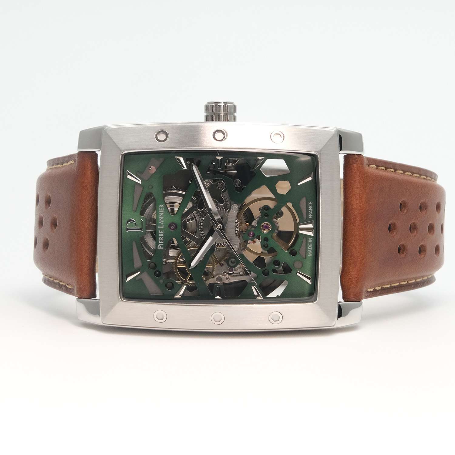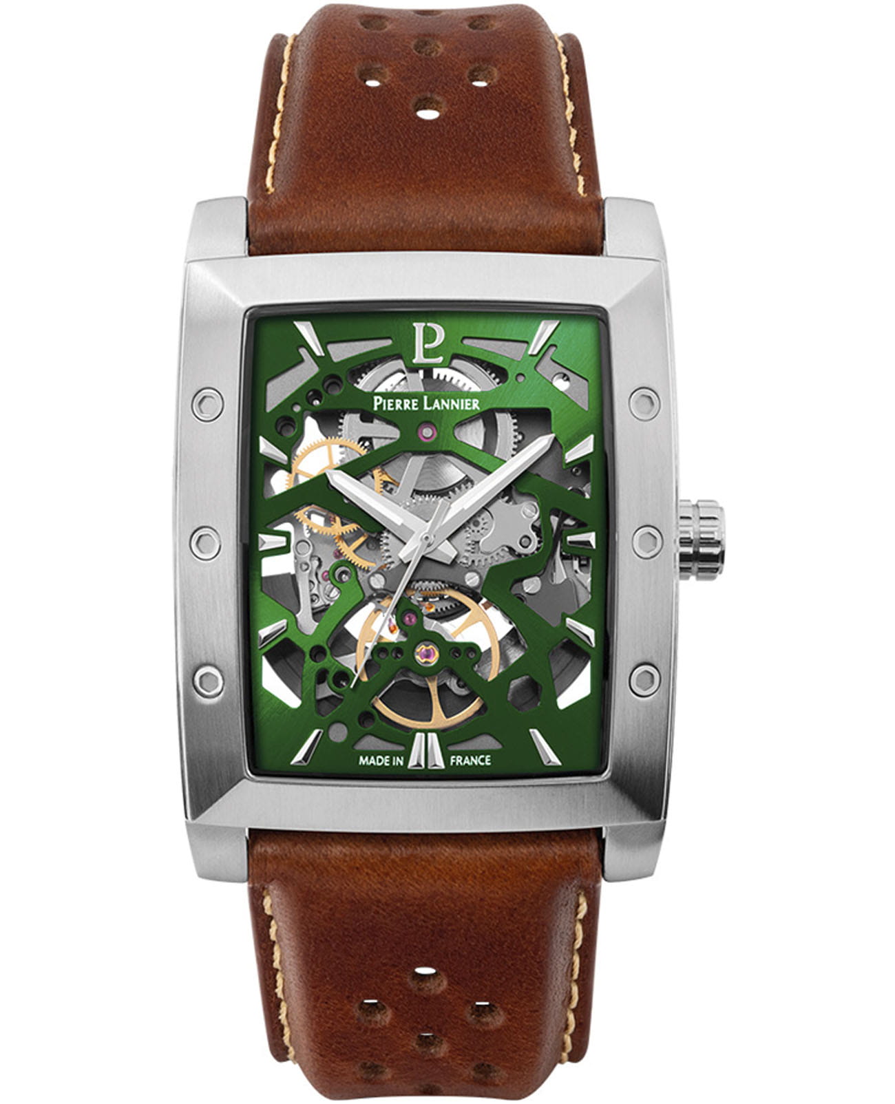 Мужские механические часы Pierre Lannier Hector 342A174 представляют собой уникальное сочетание винтажного стиля и современных технологий с корпусом "тонно" размером 36×42 мм из нержавеющей стали и прозрачным зеленым скелетонизированным циферблатом, раскрывающим работу автоматического механизма. Модель оснащена автоматическим механизмом с ручным подзаводом и 40-часовым запасом хода, демонстрирующим точное движение стрелок через прозрачный циферблат. Защиту обеспечивает устойчивое к царапинам минеральное стеклоМинеральное стеклоМинеральное стекло представляет собой искусственно выращенный минерал кварца. Такое стекло отличается особой устойчивостью к повреждениям и царапинам. Уступает по некоторым качествам сапфировому стеклу., а водонепроницаемость WR50 (5 бар) позволяет использовать часы при плавании в бассейне. Кожаный ремешок из коричневой кожи махагони с перфорацией шириной 26 мм и классической пряжкой добавляет ретро-характер и легко заменяется на другие ремешки коллекции. Особенности включают матово-полированную отделку корпуса, серебристые стрелки и индексы на зеленом циферблате, а также прозрачную заднюю крышку, демонстрирующую механизм.