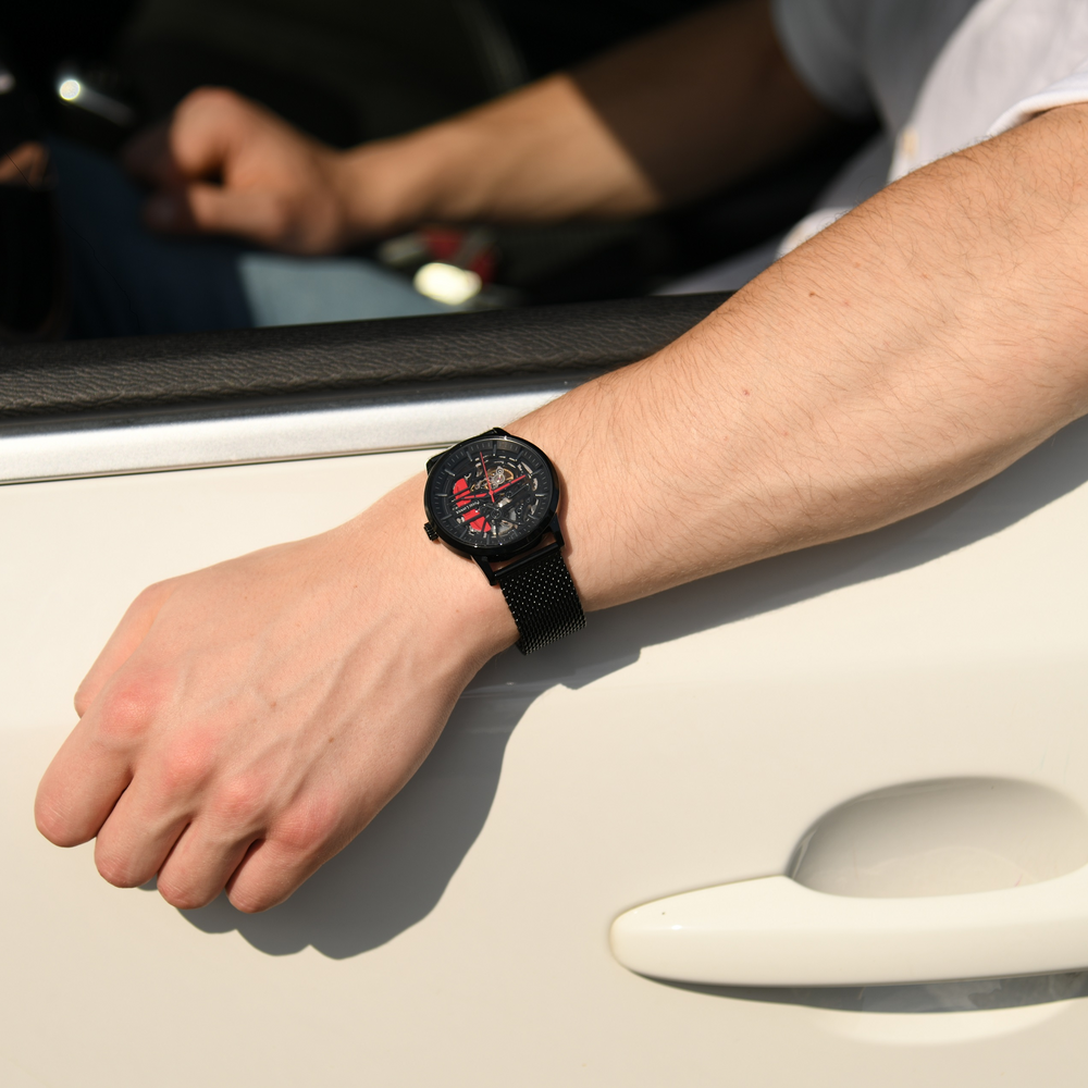 Мужские механические часы с автоподзаводом Pierre Lannier Paddock 385C439. Минеральное стеклоМинеральное стеклоМинеральное стекло представляет собой искусственно выращенный минерал кварца. Такое стекло отличается особой устойчивостью к повреждениям и царапинам. Уступает по некоторым качествам сапфировому стеклу. устойчивое к мелким механическим повреждениям. Центральные часовая, минутная и секундная стрелки. Корпус выполнен из нержавеющей стали с IP-покрытиемIP-покрытиеМетод ионного напыления. Демонстрирует повышенную устойчивость к истиранию, окислению и химическим веществам. Под воздействием высокого давления и температуры около 1500°C молекулы металла надёжно соединяются с частицами корпуса часов.. Водостойкость: 50 метров, позволит защитить корпус от случайных брызг или капель дождя. Стальной браслет миланского плетения с раскладной застёжкойРаскладная застёжкаТакой тип застёжки используется только на браслетах из металла. Она никогда не раскрывается полностью, происходит разделение на 2 и более частей. Раскладывающая застёжка снизит вероятность потери часов к минимуму.. Черный скелетонизированный циферблат. В комплекте черный кожаный ремешок с перфорацией.