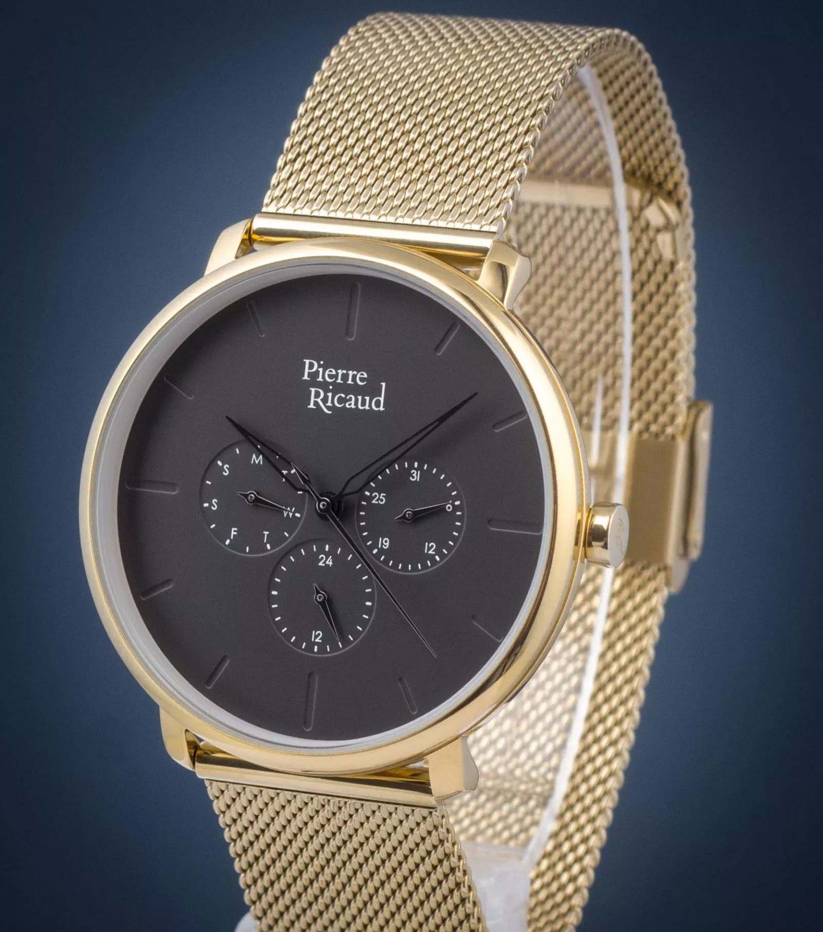 Мужские часы с минеральным стекломМинеральное стеклоМинеральное стекло представляет собой искусственно выращенный минерал кварца. Такое стекло отличается особой устойчивостью к повреждениям и царапинам. Уступает по некоторым качествам сапфировому стеклу. Pierre Ricaud P97169.1116QF, кварцевый механизм с высокой точностью. Класс водозащиты: 50 метров, позволит защитить корпус от случайных брызг или капель дождя. Корпус часов изготовлен из стали с IP-покрытиемIP-покрытиеМетод ионного напыления. Демонстрирует повышенную устойчивость к истиранию, окислению и химическим веществам. Под воздействием высокого давления и температуры около 1500°C молекулы металла надёжно соединяются с частицами корпуса часов.. Стальной браслет на раскладной застёжкеРаскладная застёжкаТакой тип застёжки используется только на браслетах из металла. Она никогда не раскрывается полностью, происходит разделение на 2 и более частей. Раскладывающая застёжка снизит вероятность потери часов к минимуму. с IP-покрытиемIP-покрытиеМетод ионного напыления. Демонстрирует повышенную устойчивость к истиранию, окислению и химическим веществам. Под воздействием высокого давления и температуры около 1500°C молекулы металла надёжно соединяются с частицами корпуса часов..