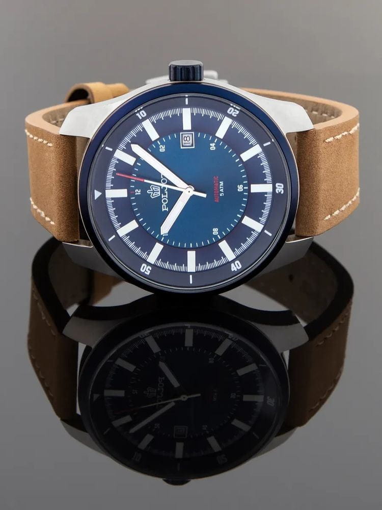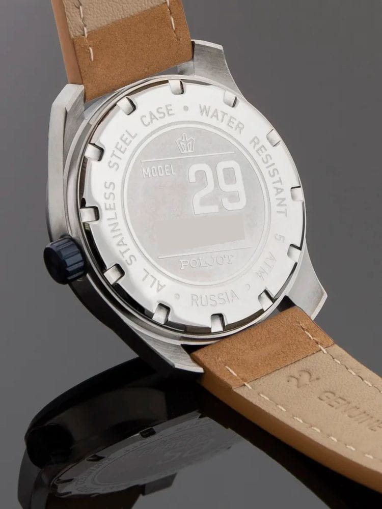 Poljot 8215.291231 — современные механические часы с автоподзаводом, воплощающие дух надёжности и динамичного стиля. Корпус из нержавеющей стали гармонично сочетается с насыщенным циферблатом, украшенным радиальным узором, а контрастные акценты придают модели выразительность и спортивный характер. БезельБезельВнешний ободок, закрепляющий стекло. В спортивных часах так называется поворотное кольцо с делениями на циферблате, выполняет роль таймера – замеряет отрезки времени на шкале. Неподвижный безель – элемент декора. Однонаправленно вращающийся безель на дайверских часах позволяет фиксировать моменты погружения и выныривания на поверхность. с PVD-покрытиемPVDУльтратонкое покрытие наносится в технике вакуумного напыления, сочетает в себе нитрид титана особой прочности со слоем золота или оксида хрома. Несёт в себе декоративную или защитную функцию.. В основе конструкции — проверенный японский калибр Miyota 8215, обеспечивающий точный ход и плавное движение стрелок. Метки и стрелки с люминесцентным покрытиемЛюминесцентное покрытиеПозволяет считывать показания времени в темноте. Производители наносят на стрелки, часовые индексы, безель или поверхность циферблата светонакопительный состав, дающий холодное свечение. обеспечивают отличную читаемость даже в условиях слабого освещения. Окно даты, подчеркивая симметрию дизайна. Прочное минеральное стеклоМинеральное стеклоМинеральное стекло представляет собой искусственно выращенный минерал кварца. Такое стекло отличается особой устойчивостью к повреждениям и царапинам. Уступает по некоторым качествам сапфировому стеклу. надёжно защищает циферблат, а ремешок из натуральной кожи с контрастной строчкой придаёт модели уют и стиль. Poljot — универсальные часы для мужчины, ценящего механическую точность и уверенный, сдержанный стиль в каждой детали.