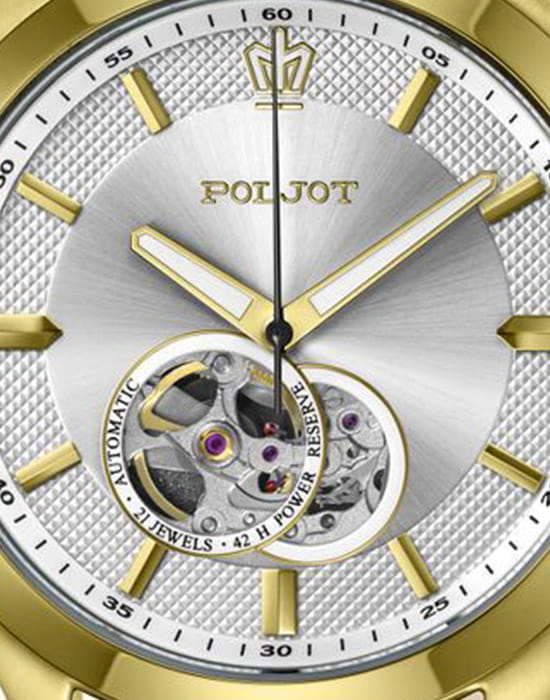 Poljot 82S0.746095  — элегантные механические мужские часы с автоподзаводом, сочетающие традиции отечественного часового производства и классический дизайн. Корпус из нержавеющей стали с тёплым золотистым с PVD-покрытиемPVDУльтратонкое покрытие наносится в технике вакуумного напыления, сочетает в себе нитрид титана особой прочности со слоем золота или оксида хрома. Несёт в себе декоративную или защитную функцию. придаёт модели благородный характер, а серебристый циферблат с чёткой разметкой подчёркивает функциональную строгость стиля. Надёжный механизм с автоподзаводом обеспечивает плавный ход стрелок и стабильную работу. Прочное минеральное стеклоМинеральное стеклоМинеральное стекло представляет собой искусственно выращенный минерал кварца. Такое стекло отличается особой устойчивостью к повреждениям и царапинам. Уступает по некоторым качествам сапфировому стеклу. защищает циферблат от повреждений, а ремешок из натуральной кожи с классической пряжкой добавляет образу утончённости и комфорта. Poljot — это воплощение надёжности, традиции и сдержанной элегантности, идеально подходящее для повседневного делового стиля.