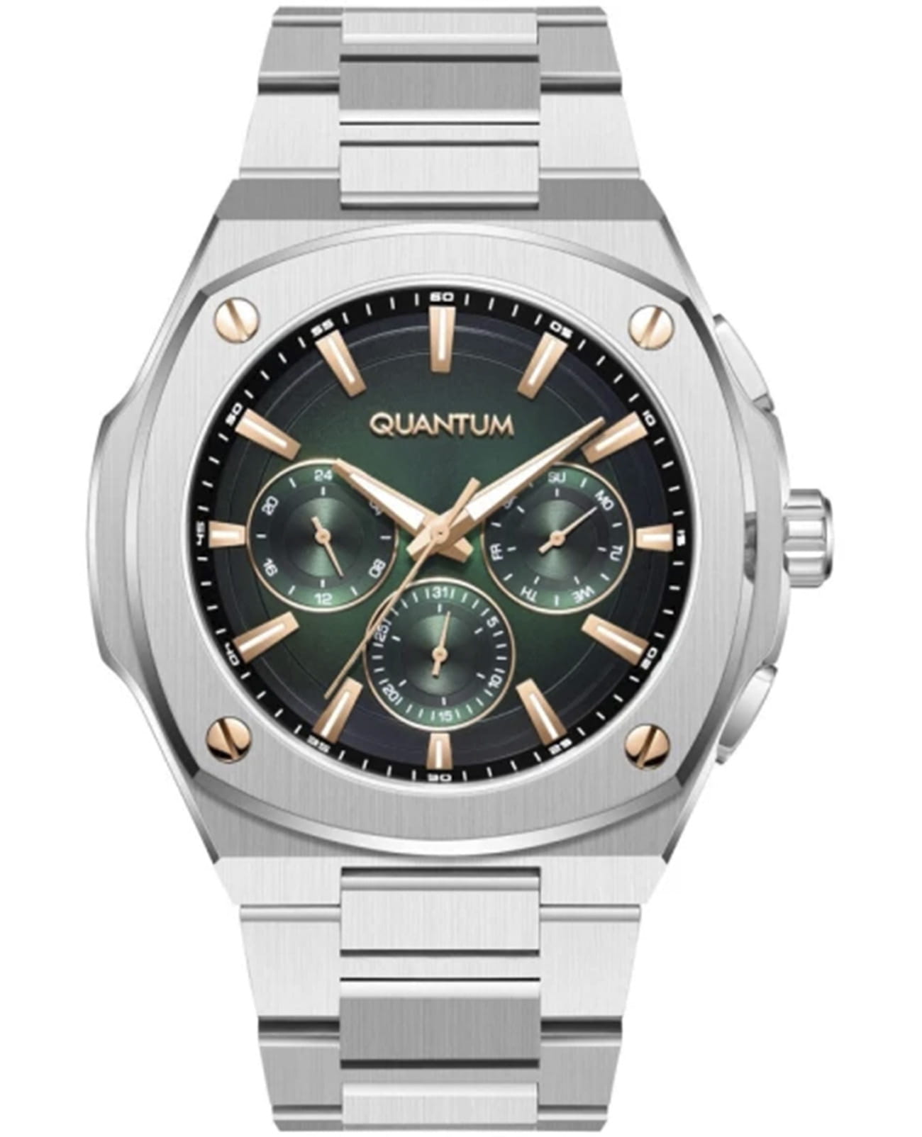 Quantum ADG1032.370 — это наручные часы, сочетающие в себе стиль, точность и надёжность. Модель выполнена в круглой форме из нержавеющей стали с минеральным стекломМинеральное стеклоМинеральное стекло представляет собой искусственно выращенный минерал кварца. Такое стекло отличается особой устойчивостью к повреждениям и царапинам. Уступает по некоторым качествам сапфировому стеклу., устойчивым к мелким повреждениям. Циферблат зелёного цвета оформлен штриховыми метками и оснащён функцией отображения даты, что делает его удобным для повседневного использования. Часы оснащены кварцевым механизмом, обеспечивающим высокую точность хода и минимальное обслуживание. Водонепроницаемость позволяет использовать их при плавании и других водных активностях без глубокого погружения. Стильная конструкция и универсальный дизайн делают модель подходящей для любого образа — от делового до неформального. Эти часы станут идеальным аксессуаром для тех, кто ценит сочетание элегантности, функциональности и надёжности — универсальное решение для повседневной носки и повседневных задач.