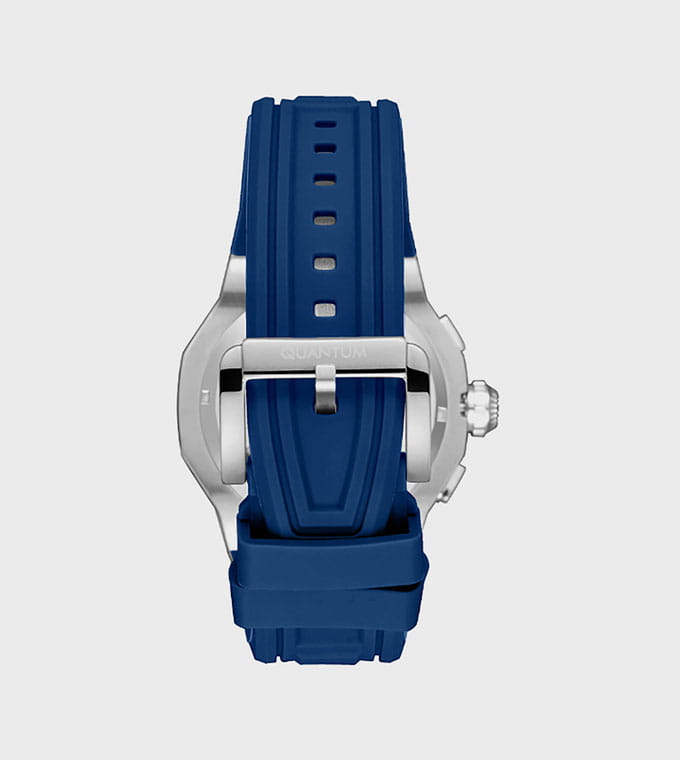 Мужские кварцевые часы Quantum из коллекции Hunter — круглый корпус размером 46 мм из нержавеющей стали, оснащённый функциями хронографаХронографФункция позволяет измерять отрезки времени с особой точностью: часы, минуты, секунды. Верным признаком хронографа является наличие на циферблате 3 дополнительных окошек-счётчиков., суточника и окошком даты. БезельБезельВнешний ободок, закрепляющий стекло. В спортивных часах так называется поворотное кольцо с делениями на циферблате, выполняет роль таймера – замеряет отрезки времени на шкале. Неподвижный безель – элемент декора. Однонаправленно вращающийся безель на дайверских часах позволяет фиксировать моменты погружения и выныривания на поверхность. из нержавеющей стали с PVD-покрытиемPVDУльтратонкое покрытие наносится в технике вакуумного напыления, сочетает в себе нитрид титана особой прочности со слоем золота или оксида хрома. Несёт в себе декоративную или защитную функцию.. Стекло — минеральноеМинеральное стеклоМинеральное стекло представляет собой искусственно выращенный минерал кварца. Такое стекло отличается особой устойчивостью к повреждениям и царапинам. Уступает по некоторым качествам сапфировому стеклу. с антибликовым покрытием. Механизм — японский кварцевый Seiko. Водонепроницаемость 100 м. Ремешок — синий силиконовый на стандартной застёжке. Идеальный выбор для тех, кто ценит турецкий дизайн и функциональный спортивный стиль.